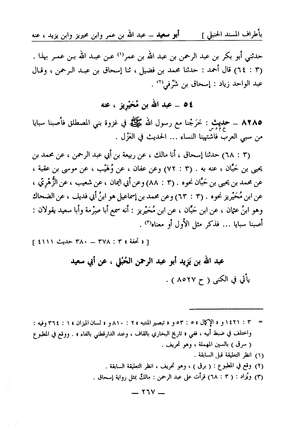 8285 -[خ م د س] حديث: خَرَجْنا مع رسول الله صَلَّى اللَّهُ عَلَيْهِ وَسَلَّمَ في غزوة بني المصطلق فأصبنا سبايا من سبي العرب فاشتهينا النِّساء ... الحديث في العَزْل. (3: 68) حَدَّثَنا إسحاق، أنا مالك، عن ربيعة بن أبي عبد الرحمن، عن محمد بن يحيى بن حَبَّان، عنه به. (3: 72) وعن عفان، عن وُهَيْب، عن موسى بن عقبة، عن محمد بن يحيى بن حَبَّان نحوه. (3: 88) وعن أبي اليَمَان، عن شُعَيب، عن الزُّهْرِيّ، عن ابن مُحَيْرِيز نحوه. (3: 63) وعن محمد بن إسماعيل هو ابن أبي فديل، عن الضحاك وهو ابن عثمان، عن ابن حَبَّان، عن ابن مُحَيْرِيز: أنه سمع أبا صِرْمة وأبا سعيد يقولان: أصبنا سبايا ... فذكر مثل الأول أو معناه.