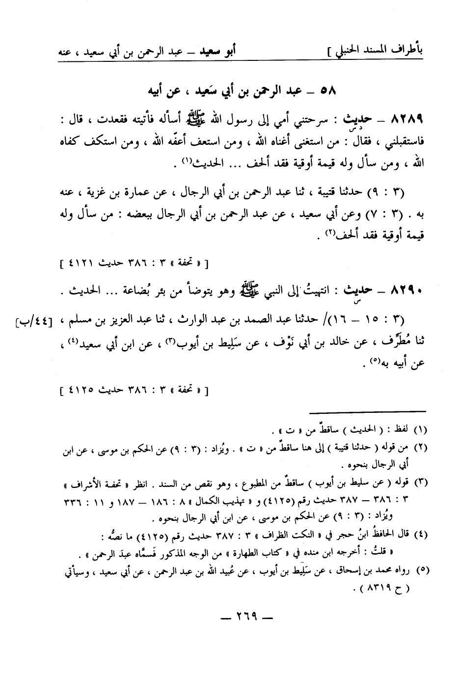 8289 -[د س] حديث: سرحتني أُمّي إلى رسول الله صَلَّى اللَّهُ عَلَيْهِ وَسَلَّمَ أسأله فأتيته فقعدت، قال: فاستقبلني، فقال: من استغنى أغناه الله، ومن استعف أعفّه الله، ومن استكف كفاه الله، ومن سأل وله قيمة أوقية فقد ألحف..... الحديث. (3: 9) حَدَّثَنا قُتَيبة، ثنا عبد الرحمن بن أبي الرجال، عن عُمارة بن غَزِيَّة، عنه به. (3: 7) وعن أبي سعيد، عن عبد الرحمن بن أبي الرجال ببعضه: من سأل وله قيمة أوقية فقد ألحف.