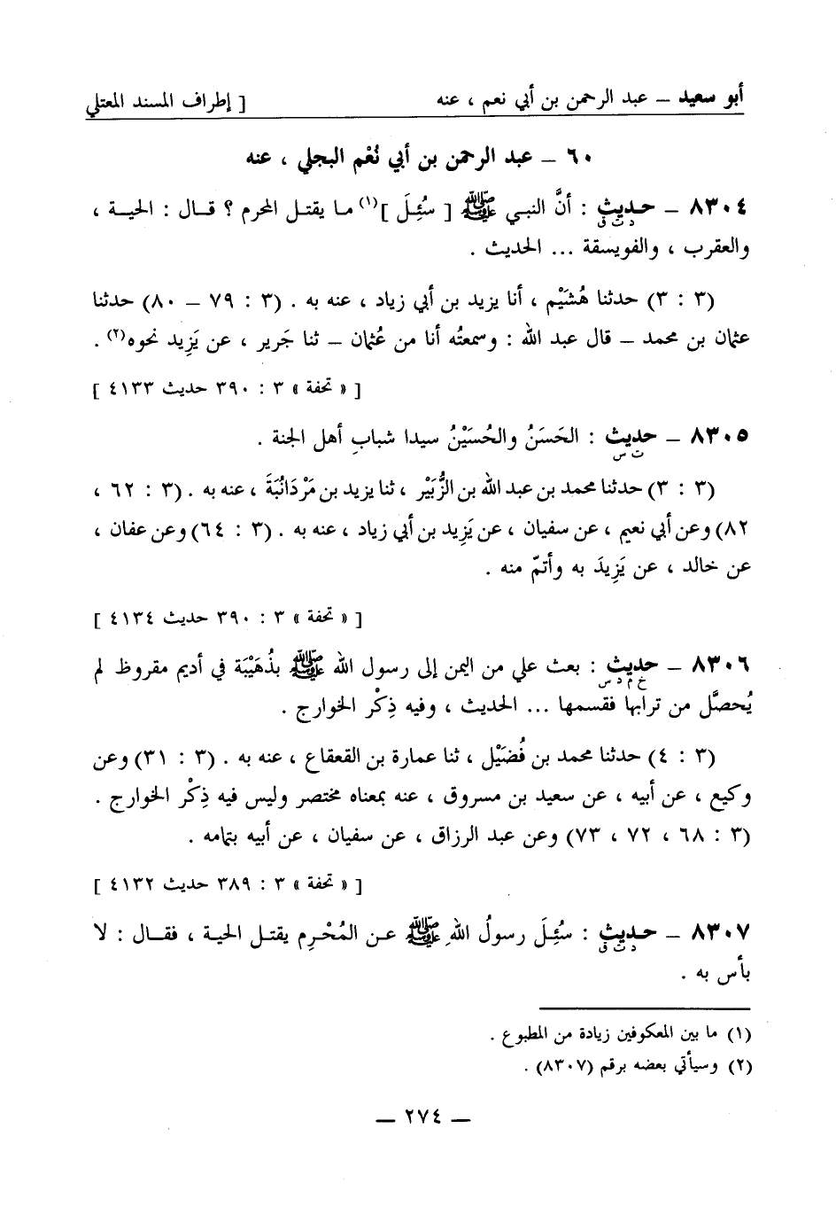 8305 -[ت س] حديث: الحَسَنُ والحُسَينُ سيدا شبابِ أهل الجَنَّة. (3: 3) حَدَّثَنا محمد بن عبد الله بن الزُّبَير، ثنا يزيد بن مَرْدَانُبَةَ، عنه به. (3: 62، 82) وعن أبي نعيم، عن سفيان، عن يزيد بن أبي زياد، عنه به. (3: 64) وعن عفان، عن خالد، عن يزيد به وأتمّ منه.