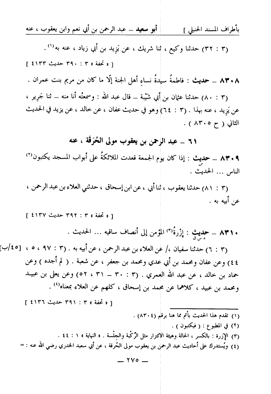 8310 -[د س ق] حديث: إِزْرةُ المؤمن إلى أنصاف ساقيه ... الحديث. (3: 6) حَدَّثَنا سفيان، عن العلاء بن عبد الرحمن، عن أبيه به. (3: 97، 5، 44) وعن عفان ومحمد بن أبي عدي ومحمد بن جعفر، عن شُعبة. (لم أجده) وعن حمّاد بن خالد، عن عبد الله العمري. (3: 30 - 31، 52) وعن يَعْلَى بن عُبَيد ومحمد بن عُبَيد، كلاهما عن محمد بن إسحاق، كُلّهم عن العلاء بمعناه.