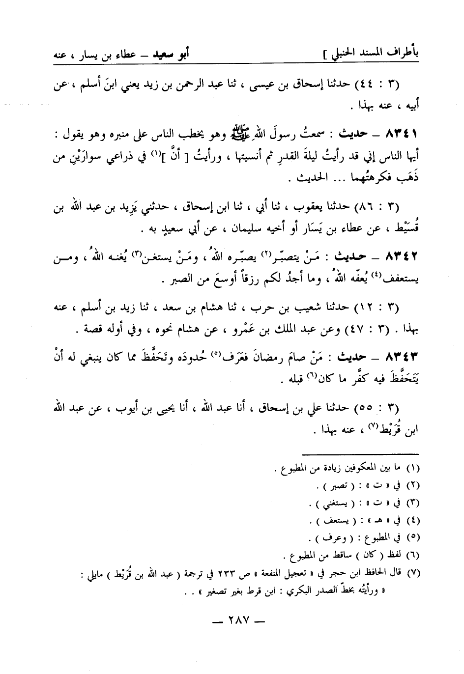 8342 - حديث: من يتصبّر يصبّره الله، ومن يستغن يُغنه الله , ومن يستعفف يُعفّه الله، وما أجد لكم رزقاً أوسعَ من الصبر. (3: 12) حَدَّثَنا شُعَيب بن حَرْب، ثنا هشام بن سعد، ثنا زيد بن أسلم، عنه بهذا. (3: 47) وعن عبد الملك بن عمرو، عن هشام نحوه، وفي أوله قصة.