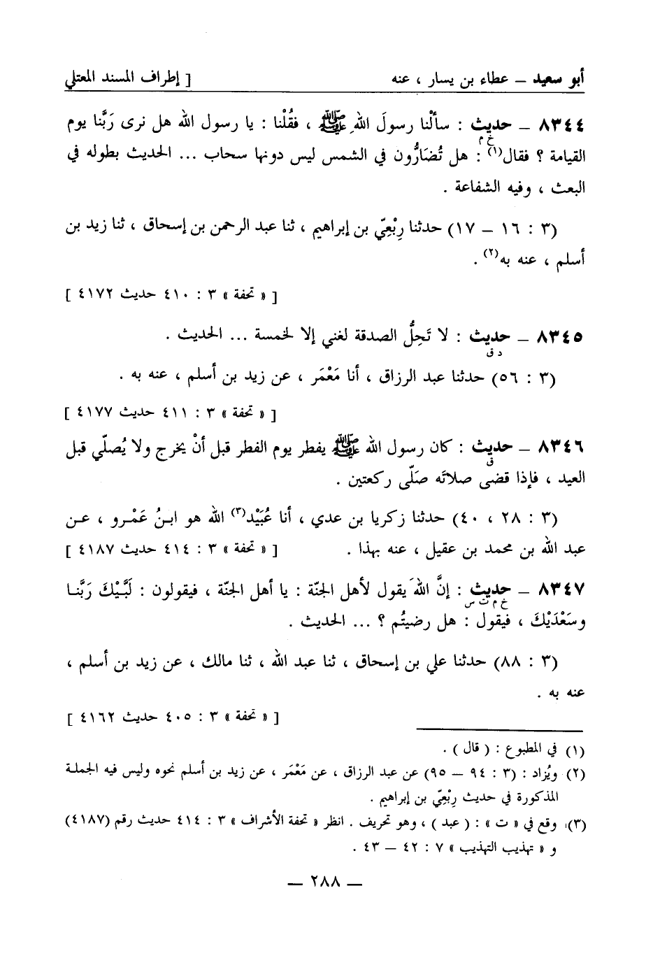 8344 -[خ م] حديث: سألنا رسولَ اللهِ صَلَّى اللَّهُ عَلَيْهِ وَسَلَّمَ، فقلنا: يا رسول الله هل نرى رَبَّنا يوم القيامة؟ فقال: هل تُضَارُّون في الشَّمس ليس دونها سحاب ... الحديث بطوله في البعث، وفيه الشفاعة. (3: 16 - 17) حَدَّثَنا رِبْعِيّ بن إبراهيم، ثنا عبد الرحمن بن إسحاق، ثنا زيد بن أسلم، عنه به.