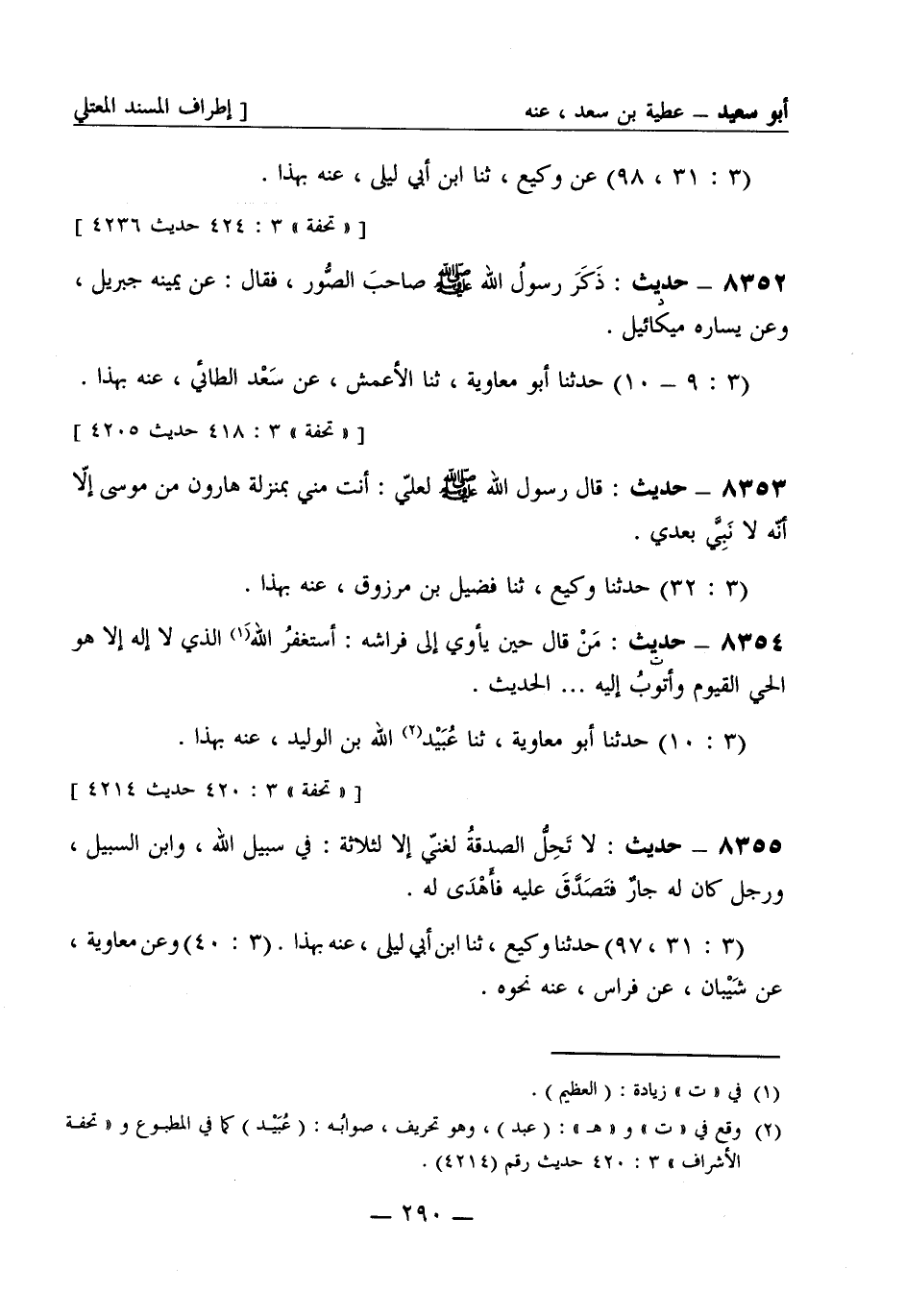 8355 - حديث: لا تَحِلُّ الصدقةُ لغنيّ إلا لثلاثة: في سبيل الله، وابن السبيل، ورجل كان له جارٌ فتَصَدَّقَ عليه فأَهْدَى له. (3: 31، 97) حَدَّثَنا وكيع، ثنا ابن أبي ليلى، عنه بهذا. (3: 40) وعن معاوية، عن شَيْبان، عن فراس، عنه نحوه.