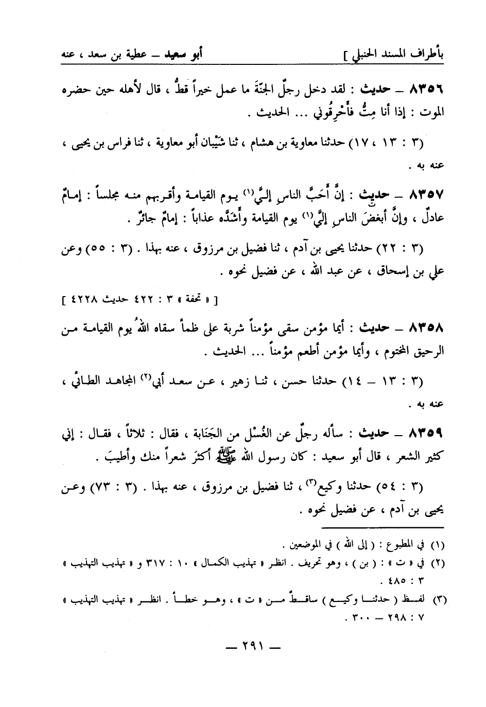 8359 - حديث: سأله رجلٌ عن الغُسل من الجَنَابة، فقال: ثلاثاً، فقال: إني كثير الشَّعر، قال أبو سعيد: كان رسول الله صَلَّى اللَّهُ عَلَيْهِ وَسَلَّمَ أكثرَ شعراً منك وأطيب. (3: 54) حَدَّثَنا وكيع، ثنا فُضَيل بن مرزوق، عنه بهذا. (3: 73) وعن يحيى بن آدم، عن فُضَيل نحوه.