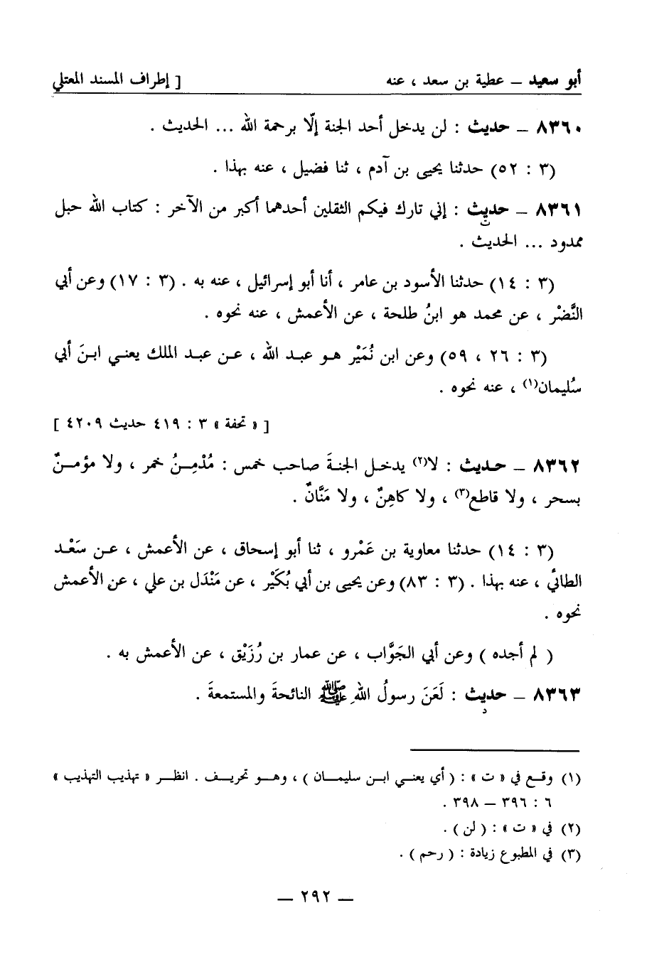 8361 -[ت] حديث: إني تارك فيكم الثقلين أحدهما أكبر من الآخر: كتاب الله حبل ممدود ... الحديث. (3: 14) حَدَّثَنا الأسود بن عامر، أنا أبو إسرائيل، عنه به. (3: 17) وعن أبي النَّضْر، عن محمد هو ابن طلحة، عن الأعمش، عنه نحوه. (3: 26، 59) وعن ابن نُمَير هو عبد الله، عن عبد الملك يعني ابن أبي سليمان، عنه نحوه.
