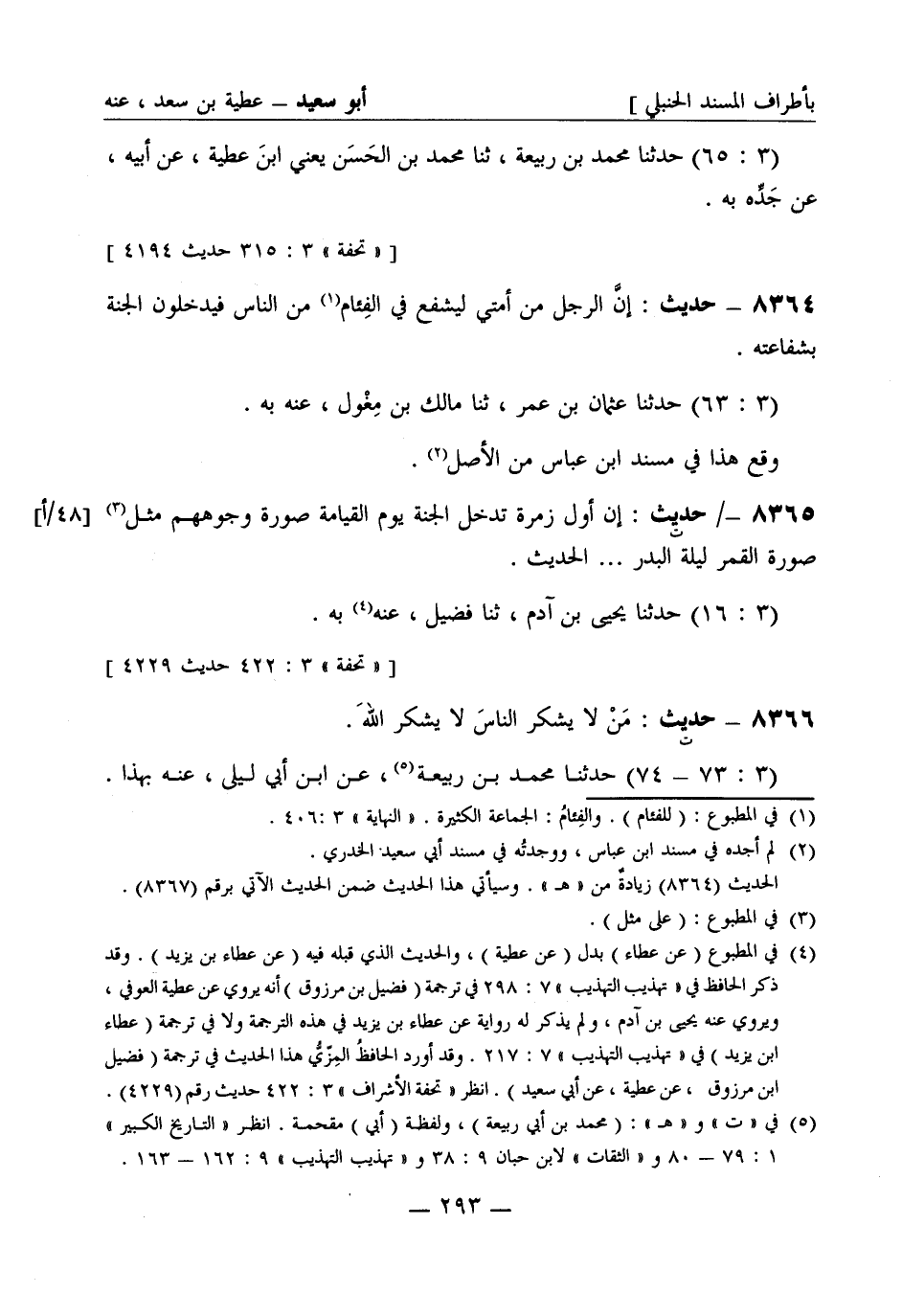 8366 -[ت] حديث: من لا يشكر الناسَ لا يشكر الله. (3: 73 - 74) حَدَّثَنا محمد بن ربيعة، عن ابن أبي ليلى، عنه بهذا -[294]-. (3: 32) وعن المطلب بن زياد، عن ابن أبي ليلى نحوه.
