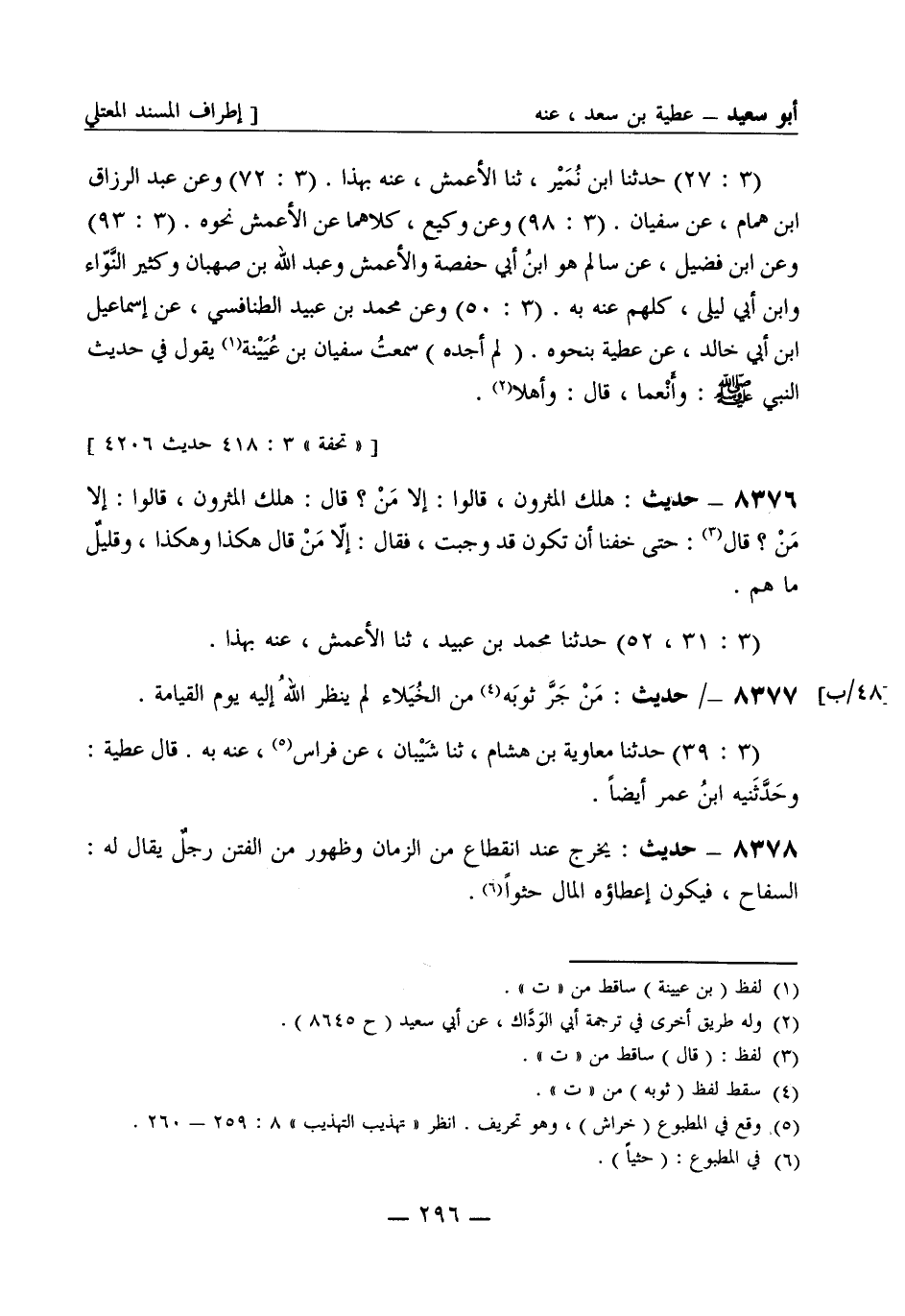 8376 - حديث: هلك المثرون، قالوا: إلا مَنْ؟ قال: هلك المثرون، قالوا: إلا مَنْ؟ قال: حتى خفنا أن تكون قد وجبت، فقال: إلا مَنْ قال هكذا وهكذا، وقليلٌ ما هم. (3: 31، 52) حَدَّثَنا محمد بن عُبَيد، ثنا الأعمش، عنه بهذا.