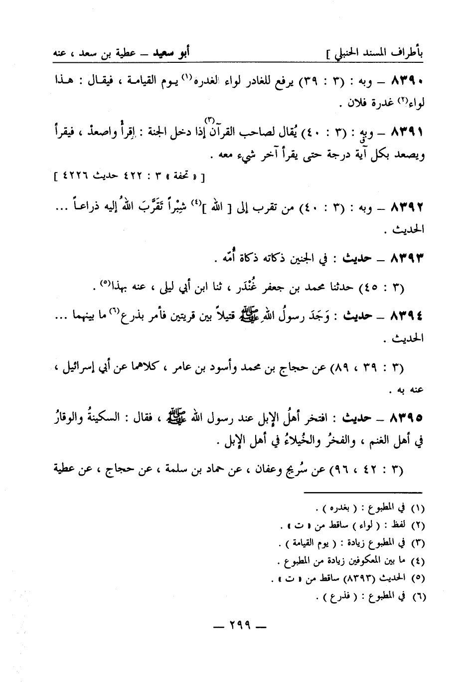 8395 - حديث: افتخر أهلُ الإبل عند رسول الله صَلَّى اللَّهُ عَلَيْهِ وَسَلَّمَ، فقال: السكينةُ والوقارُ في أهل الغنم، والفخرُ والخُيَلاءُ في أهل الإبل. (3: 42، 96) عن سُرَيج وعفان، عن حمّاد بن سَلَمة، عن حجاج، عن عطية -[300]- به. وفي حديث عفان زيادة: بُعث موسى وهو يرعى غنماً على أهله، وبُعثتُ أنا أرعى غنماً لأهلي بجِياد.