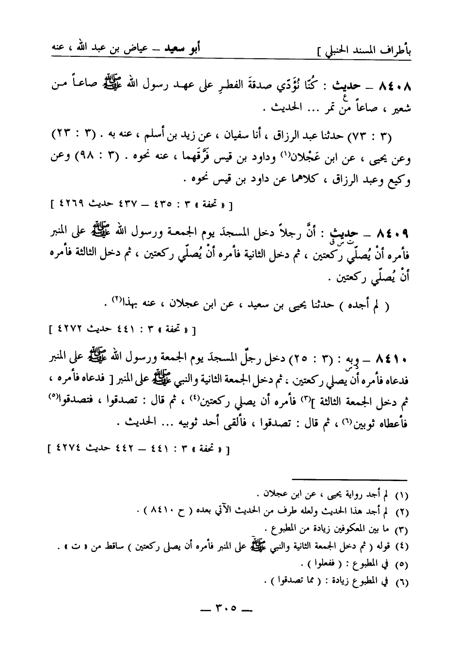 8410 - وبه: (3: 25) دخل رجلٌ المسجدَ يوم الجمعة ورسول الله صَلَّى اللَّهُ عَلَيْهِ وَسَلَّمَ على المنبر فدعاه فأمره أن يُصَلّي ركعتين، ثم دخل الجمعة الثانية والنبيّ صَلَّى اللَّهُ عَلَيْهِ وَسَلَّمَ على المنبر [فدعاه فأمره، ثم دخل الجمعة الثالثة] فأمره أن يُصَلّي ركعتين، ثم قال: تصدقوا، فتصدقوا فأعطاه ثوبين، ثم قال: تصدقوا، فألقى أحد ثوبيه ... الحديث.