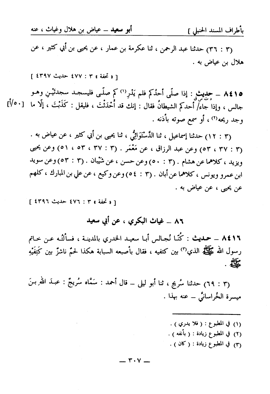 8415 -[د ت س ق] حديث: إذا صَلّى أَحَدُكم فلم يَدْرِ كم صَلّى فليسجد سجدتَيْن وهو جالس، وإذا جاء أحدكم الشيطانُ فقال: إنك قد أَحْدَثْتَ، فليقل: كَذَبْتَ، إلا ما وجد رِيْحه، أو سمع صوته بأُذُنه. (3: 12) حَدَّثَنا إسماعيل، ثنا الدَّسْتَوَائِيّ، ثنا يحيى بن أبي كثير، عن عياض به. (3: 37، 53) وعن عبد الرزاق، عن مَعْمَر. (3: 37، 53، 51) وعن يحيى ويزيد، كلاهما عن هشام. (3: 50) وعن حَسَن، عن شَيْبان. (3: 53) وعن سويد بن عمرو ويونس، كلاهما عن أَبَان. (3: 54) وعن وكيع، عن علي بن المبارك، كُلّهم عن يحيى، عن عياض به.