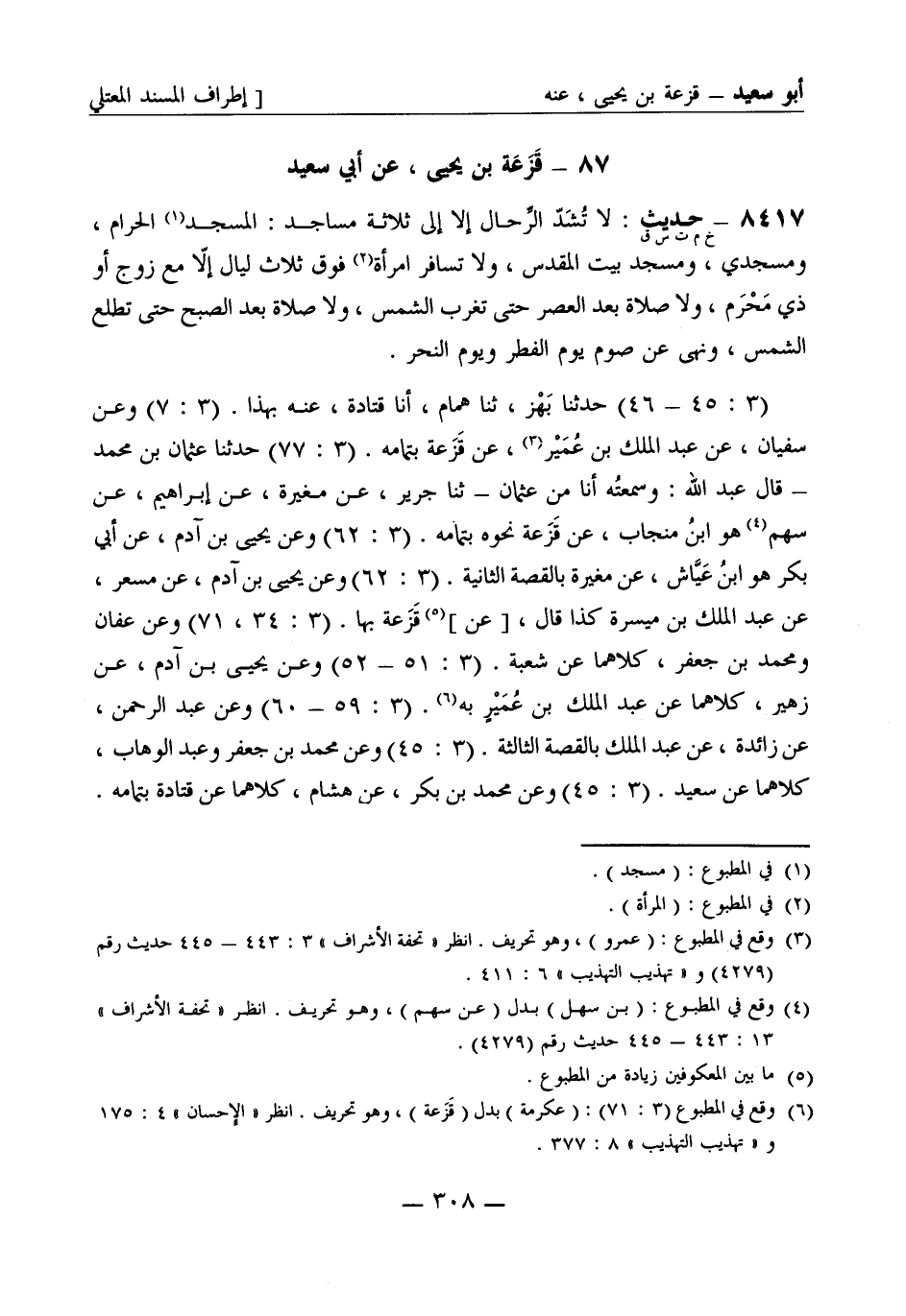 8417 -[خ م ت س ق] حديث: لا تُشَدّ الرِّحال إلا إلى ثلاثة مساجد: المسجد الحرام، ومسجدي، ومسجد بيت المقدس، ولا تسافر امرأة فوق ثلاث ليال إلا مع زوج أو ذي مَحْرَم، ولا صلاة بعد العصر حتى تغرب الشَّمس، ولا صلاة بعد الصُّبح حتى تطلع الشَّمس، ونَهَى عن صوم يوم الفِطْر ويوم النَّحْر. (3: 45 - 46) حَدَّثَنا بَهْز، ثنا هَمَّام، أنا قَتَادة، عنه بهذا. (3: 7) وعن سفيان، عن عبد الملك بن عُمَير، عن قَزَعة بتمامه. (3: 77) حَدَّثَنا عثمان بن محمد قال عبد الله: وسمعتُه أنا من عثمان - ثنا جَرِير، عن مغيرة، عن إبراهيم، عن سهم هو ابن منجاب، عن قَزَعة نحوه بتمامه. (3: 62) وعن يحيى بن آدم، عن أبي بكر هو ابن عَيَّاش، عن مغيرة بالقصة الثانية. (3: 62) وعن يحيى بن آدم، عن مِسْعَر، عن عبد الملك بن ميسرة كذا قال، [عن] قَزَعة بها. (3: 34، 71) وعن عفان ومحمد بن جعفر، كلاهما عن شُعبة. (3: 51 - 52) وعن يحيى بن آدم، عن زُهَير، كلاهما عن عبد الملك بن عُمَيرٍ به. (3: 59 - 60) وعن عبد الرحمن، عن زائدة، عن عبد الملك بالقصة الثالثة. (3: 45) وعن محمد بن جعفر وعبد الوهاب، كلاهما عن سعيد. (3: 45) وعن محمد بن بكر، عن هشام، كلاهما عن قَتَادة بتمامه -[309]-. (3: 78) وعن يعقوب، عن أبيه، عن ابن إسحاق، عن أبان بن صالح، عن قَسِيم مولى عمارة، عن قَزَعة بالقصة الأولى.