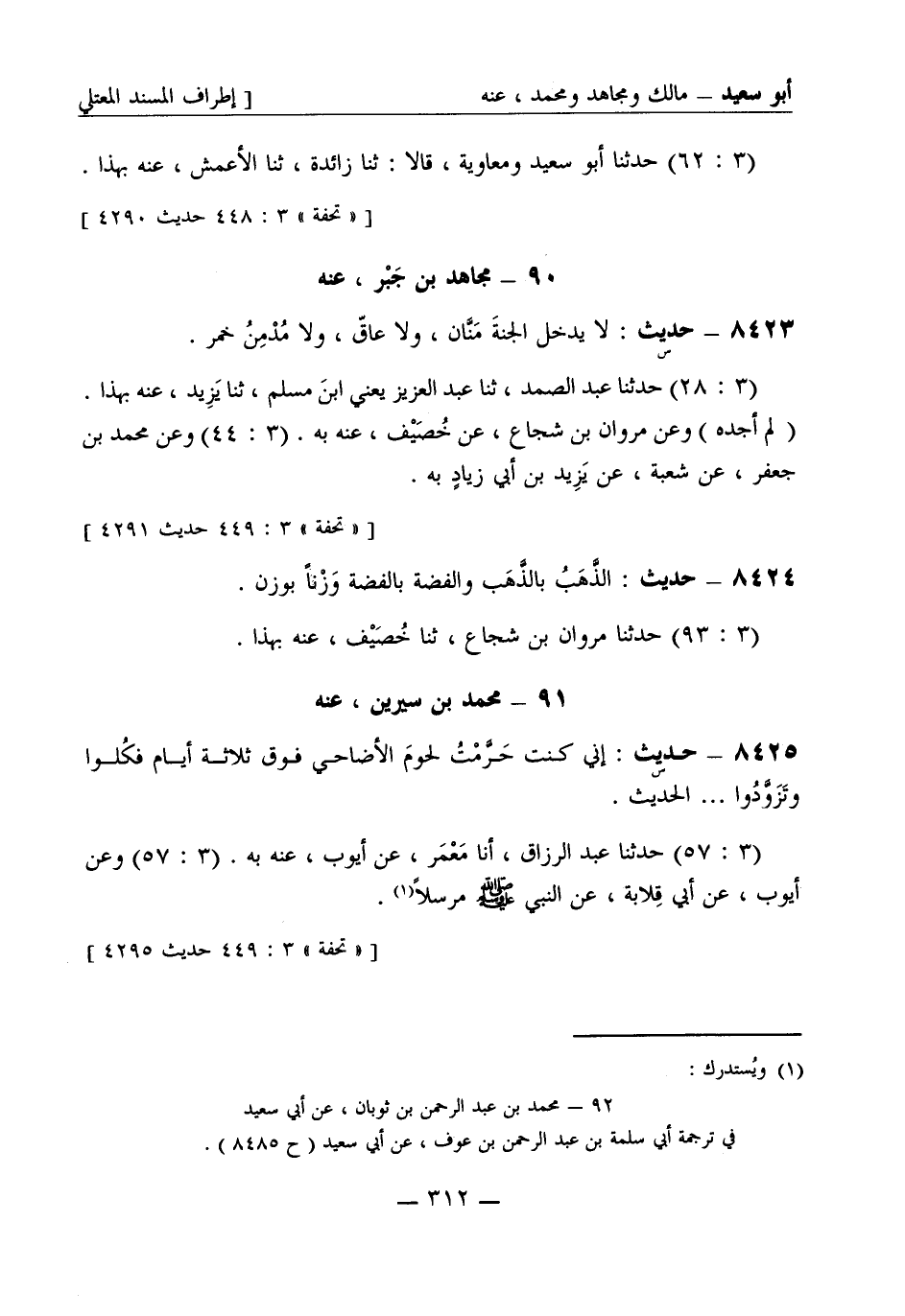 8425 -[س] حديث: إني كنت حَرَّمْتُ لحومَ الأضاحي فوق ثلاثة أيام فكُلوا وتَزَوَّدُوا ... . الحديث. (3: 57) حَدَّثَنا عبد الرزاق، أنا مَعْمَر، عن أيوب، عنه به. (3: 57) وعن أيوب، عن أبي قِلابة، عن النبيّ صَلَّى اللَّهُ عَلَيْهِ وَسَلَّمَ مرسلاً.