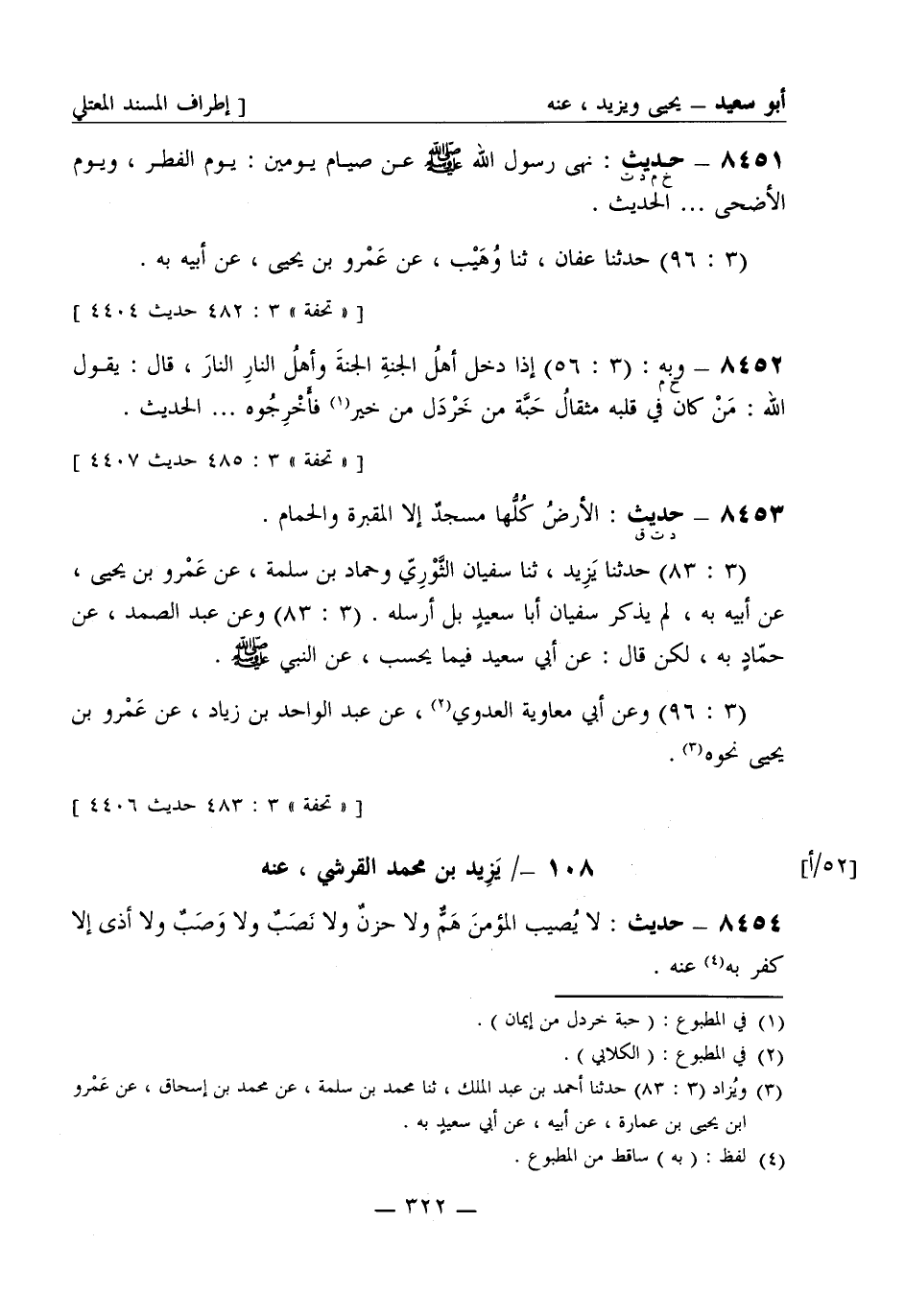 8453 -[د ت ق] حديث: الأرضُ كُلُّها مسجدٌ إلا المقبرة والحمام. (3: 83) حَدَّثَنا يزيد، ثنا سفيان الثَّوْرِيّ وحمّاد بن سَلَمة، عن عمرو بن يحيى، عن أبيه به، لم يذكر سفيان أبا سعيدٍ بل أرسله. (3: 83) وعن عبد الصمد، عن حمّادٍ به، لكن قال: عن أبي سعيد فيما يحسب، عن النبيّ صَلَّى اللَّهُ عَلَيْهِ وَسَلَّمَ. (3: 96) وعن أبي معاوية العدوي، عن عبد الواحد بن زياد، عن عمرو بن يحيى نحوه.