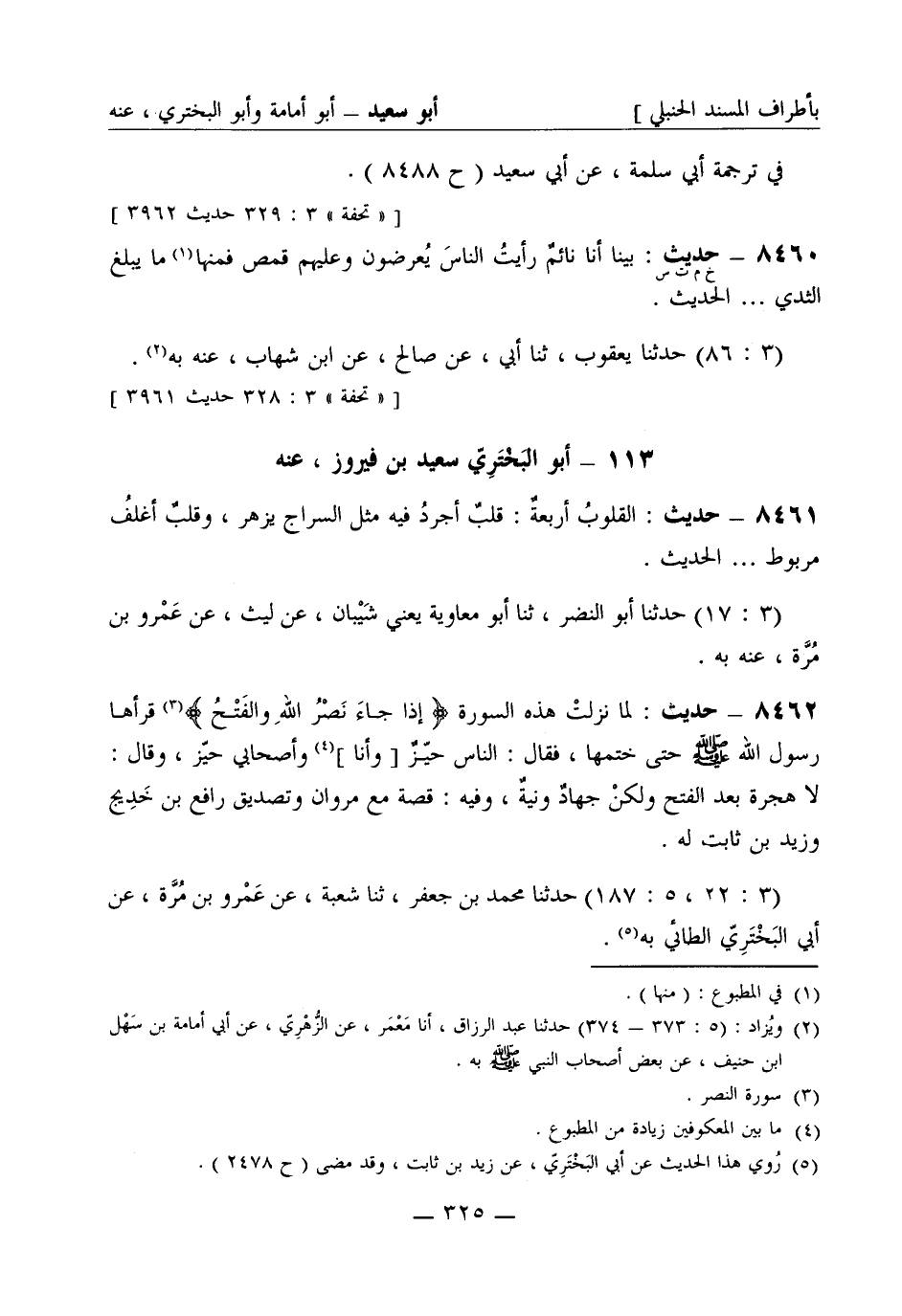 8462 - حديث: لما نزلت هذه السورة إِذَا جَاءَ نَصْرُ اللهِ وَالفَتْحُ قرأها رسول الله صَلَّى اللَّهُ عَلَيْهِ وَسَلَّمَ حتى ختمها، فقال: الناس حيّزٌ [وأنا] وأصحابي حيّز، وقال: لا هجرة بعد الفتح ولكن جهادٌ ونيةٌ، وفيه: قصة مع مروان وتصديق رافع بن خَدِيج وزيد بن ثابت له. (3: 22، 5: 187) حَدَّثَنا محمد بن جعفر، ثنا شُعبة، عن عمرو بن مُرَّة، عن أبي البختري الطائي -[326]- به.