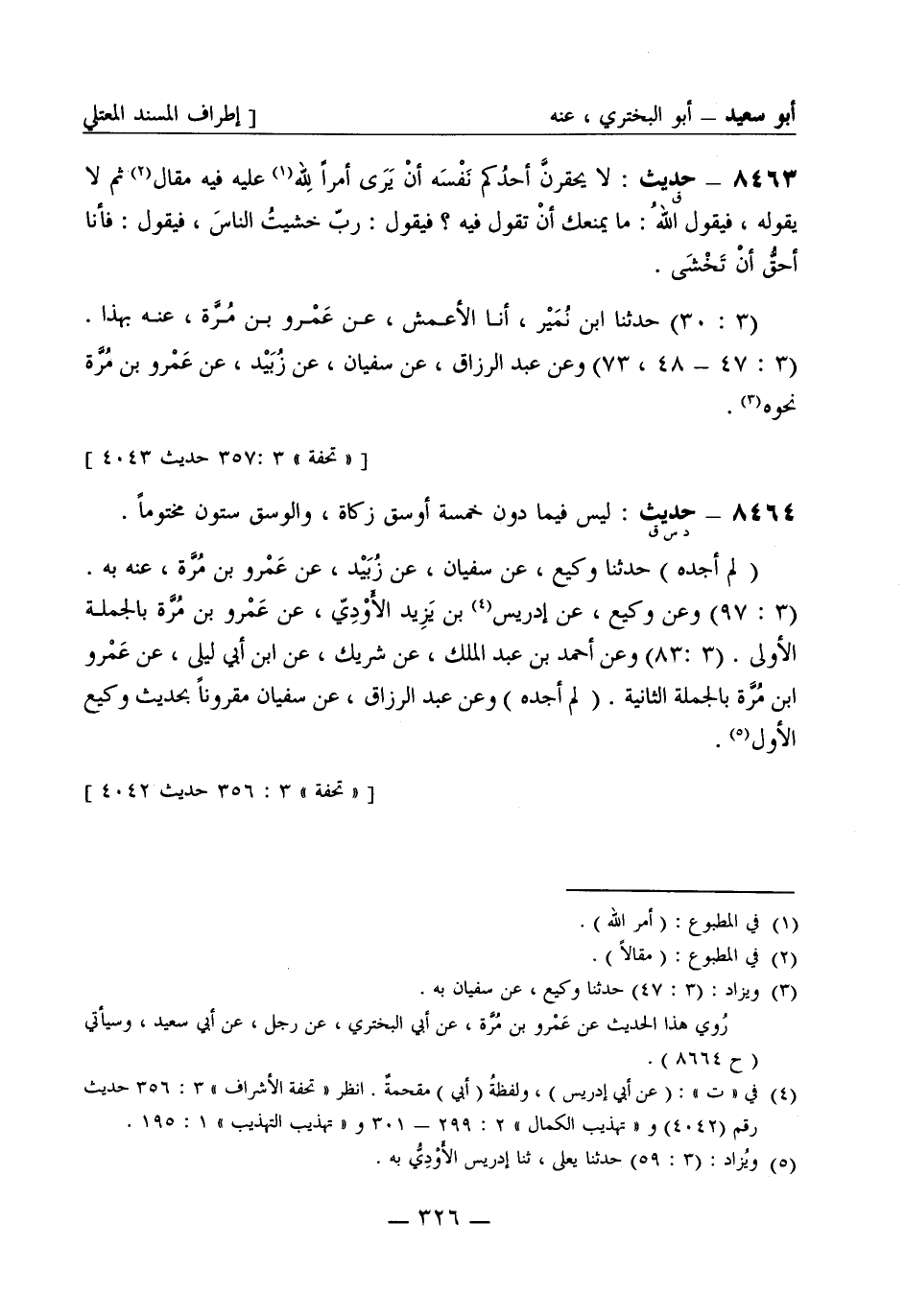 8463 -[ق] حديث: لا يحقرنَّ أَحَدُكم نَفْسَه أن يَرَى أمراً لله عليه فيه مقال ثم لا يقوله، فيقول الله: ما يمنعك أن تقول فيه؟ فيقول: رَبّ خشيتُ الناسَ، فيقول: فأنا أحقُّ أن تَخْشَى. (3: 30) حَدَّثَنا ابن نُمَير، أنا الأعمش، عن عمرو بن مُرَّة، عنه بهذا. (3: 47 - 48، 73) وعن عبد الرزاق، عن سفيان، عن زُبَيْد، عن عمرو بن مُرَّة نحوه.