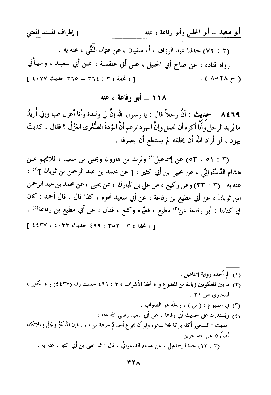 8469 -[د س] حديث: أنَّ رجلاً قال: يا رسول الله إنَّ لي وليدة وأنا أعزل عنها وإني أُريدُ ما يُريد الرجل وأنا أكره أن تحمل وإنَّ اليهود تزعم أنَّ المؤدةَ الصُّغْرى العَزْلُ؟ فقال: كذبت يهود، لو أراد الله أن يخلقه لم يستطع أن يصرفه. (3: 51، 53) عن إسماعيل ويزيد بن هارون ويحيى بن سعيد، ثلاثتهم عن هشام الدَّسْتَوَائِيّ، عن يحيى بن أبي كثير، [عن محمد بن عبد الرحمن بن ثَوْبان] ، عنه به. (3: 33) وعن وكيع، عن علي بن المبارك، عن يحيى، عن محمد بن عبد الرحمن بن ثَوْبان، عن أبي مطيع بن رفاعة، عن أبي سعيد نحوه، كذا قال: قال أحمد: كان في كتابنا: أبو رفاعة عن مطيع، فغيّره وكيع، فقال: عن أبي مطيع بن رفاعة.
