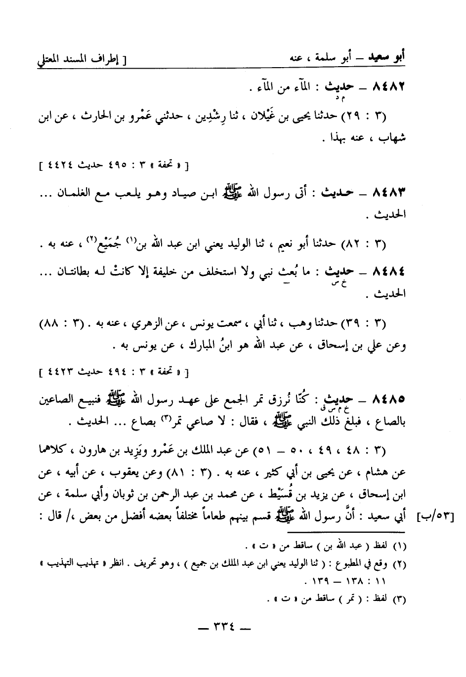 8485 -[خ م س ق] حديث: كُنّا نُرزق تَمْر الجمع على عهد رسول الله صَلَّى اللَّهُ عَلَيْهِ وَسَلَّمَ فنبيع الصاعين بالصاع، فبلغ ذلك النبيّ صَلَّى اللَّهُ عَلَيْهِ وَسَلَّمَ، فقال: لا صاعي تَمْر بصاع ... . الحديث. (3: 48، 49، 50 - 51) عن عبد الملك بن عمرو ويزيد بن هارون، كلاهما عن هشام، عن يحيى بن أبي كثير، عنه به. (3: 81) وعن يعقوب، عن أبيه، عن ابن إسحاق، عن يزيد بن قُسَيْط، عن محمد بن عبد الرحمن بن ثَوْبان وأبي سَلَمة، عن أبي سعيد: أنَّ رسول الله صَلَّى اللَّهُ عَلَيْهِ وَسَلَّمَ قسم بينهم طعاماً مختلفاً بعضه أفضل من بعض، قال: -[335]- فذهبنا نتزايد بيننا، فمنعنا رسول الله صَلَّى اللَّهُ عَلَيْهِ وَسَلَّمَ أن نبتاعه إلا كَيْلاً بكَيْل لا زيادة فيه.