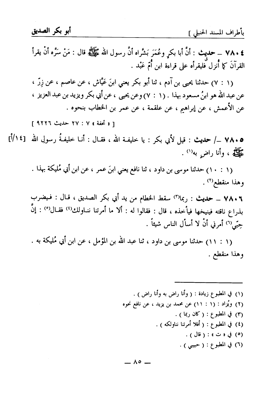 7806 - حديث: ربما سقط الخطام من يد أبي بكر الصِّدِّيق، قال: فيضرب بذراع ناقته فينيخها فيأخذه، قال: فقالوا له: ألا ما أمرتنا نناولك فقال: إن حِبّي أمرني أن لا أسأل الناس شيئاً. (1: 11) حَدَّثَنا موسى بن داود، ثنا عبد الله بن المُؤمّل، عن ابن أبي مُلَيْكَة به. وهذا منقطع.