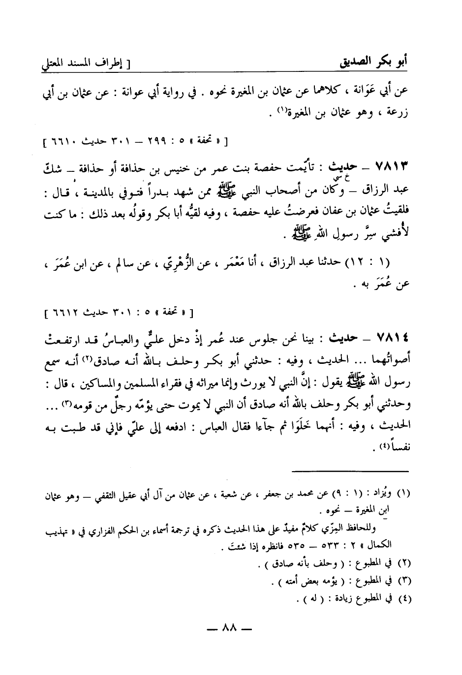 7814 - حديث: بينا نحن جلوس عند عمر إذ دخل عليٌّ والعباسُ قد ارتفعت أصواتُهما ... الحديث، وفيه: حَدَّثَني أبو بكر وحلف بالله أنه صادق أنه سمع رسول الله صَلَّى اللَّهُ عَلَيْهِ وَسَلَّمَ يقول: إنَّ النبيّ لا يورث وإنما ميراثه في فقراء المسلمين والمساكين، قال: وحَدَّثَني أبو بكر وحلف بالله أنه صادق أنَّ النبيَّ لا يموت حتى يؤمّه رجلٌ من قومه ... الحديث، وفيه: أنهما خَلَوَا ثم جآءا فقال العباس: ادفعه إلى عليّ فإني قد طبت به نَفْساً -[89]-. (1: 13) حَدَّثَنا يحيى بن حمّاد، ثنا أبو عَوَانة، عن عاصم بن كليب، حَدَّثَني شيخٌ من قُرَيش من بني تَيْم، قال: حَدَّثَني فلان وفلان وفلان وقال بعد ستة أو سبعة: كُلّهم من قُرَيش فيهم عبد الله بن الزُّبَير ... فذكره.