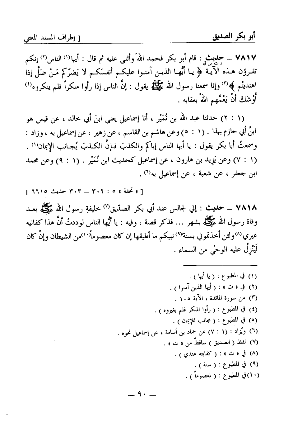 7817 -[د ت س ق] حديث: قام أبو بكر فحمد اللهَ وأثنى عليه ثم قال: أيُّها الناس إنكم تقرؤن هذه الآية: يَا أَيُّهَا الَّذِينَ آمَنُوا عَلَيْكُمْ أَنفُسَكُمْ لا يَضُرُّكُم مَن ضَلَّ إِذَا اهْتَدَيْتُم وإنا سمعنا رسول الله صَلَّى اللَّهُ عَلَيْهِ وَسَلَّمَ يقول: إنَّ الناس إذا رأوا منكراً فلم ينكروه أَوْشَكَ أن يَعُمَّهم اللهُ بعقابه. (1: 2) حَدَّثَنا عبد الله بن نُمَير، أنا إسماعيل يعني ابن أبي خالد، عن قيس هو ابن أبي حازم بهذا. (1: 5) وعن هاشم بن القاسم، عن زُهَير، عن إسماعيل به، وزاد: وسمعتُ أبا بكر يقول: يا أيُّها الناس إياكم والكذبَ فإنَّ الكذبَ يُجانب الإيمان. (1: 7) وعن يزيد بن هارون، عن إسماعيل كحديث ابن نُمَير. (1: 9) وعن محمد بن جعفر، عن شُعبة، عن إسماعيل به.