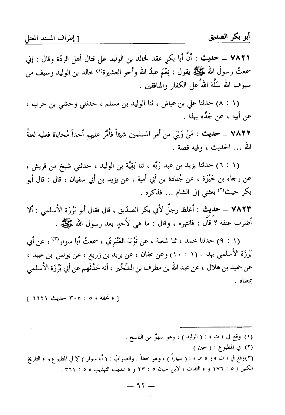 7821 - حديث: أنَّ أبا بكرٍ عقد لخالد بن الوليد على قتال أهل الردّة وقال: إني سمعتُ رسول الله صَلَّى اللَّهُ عَلَيْهِ وَسَلَّمَ يقول: نِعْمَ عبدُ الله وأخو العشيرة خالد بن الوليد وسيف من سيوف الله سَلَّهَ اللهُ على الكفار والمنافقين. (1: 8) حَدَّثَنا علي بن عياش، ثنا الوليد بن مسلم، حَدَّثَني وحشي بن حَرْب، عن أبيه، عن جَدِّه بهذا.