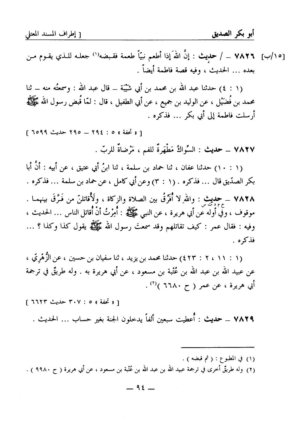 7827 - حديث: السِّواكُ مَطْهَرةٌ للفم، مَرْضاةٌ للربّ. (1: 10) حَدَّثَنا عفان، ثنا حمّاد بن سَلَمة، ثنا ابن أبي عتيق، عن أبيه: أنَّ أبا بكر الصِّدِّيق قال ... . فذكره. (1: 3) وعن أبي كامل، عن حمّاد بن سلمة ... . فذكره.