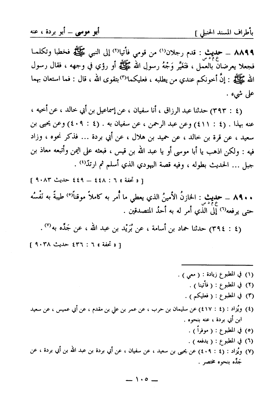 8899 -[خ م د س] حديث: قدم رجلان من قومي فأتيا إلى النبيّ صَلَّى اللَّهُ عَلَيْهِ وَسَلَّمَ فخطبا وتَكَلَّما فجعلا يعرضان بالعمل فتَغَيَّر وَجْه رسولِ الله صَلَّى اللَّهُ عَلَيْهِ وَسَلَّمَ أو رُؤي في وجهه فقال رسول الله صَلَّى اللَّهُ عَلَيْهِ وَسَلَّمَ: إنَّ أخونكم عندي من يطلبه فعليكما بتقوى الله قال: فما استعان بهما على شيء. (4: 393) حَدَّثَنا عبد الرزاق أنا سفيان عن إسماعيل بن أبي خالد عن أخيه عنه بهذا (4: 411) وعن عبد الرحمن عن سفيان به (4: 409) وعن يحيى بن سعيد عن قُرَّة بن خالد عن حُمَيد بن هلال عن أبي بُرْدَة ... فذَكَر نحوه وزاد فيه: ولكن اذهب يا أبا موسى أو يا عبد الله بن قيس فبَعَثَه على اليمن واتبعه معاذ بن جبل ... الحديث بطوله وفيه قصة اليهودي الذي أسلم ثم ارتدّ