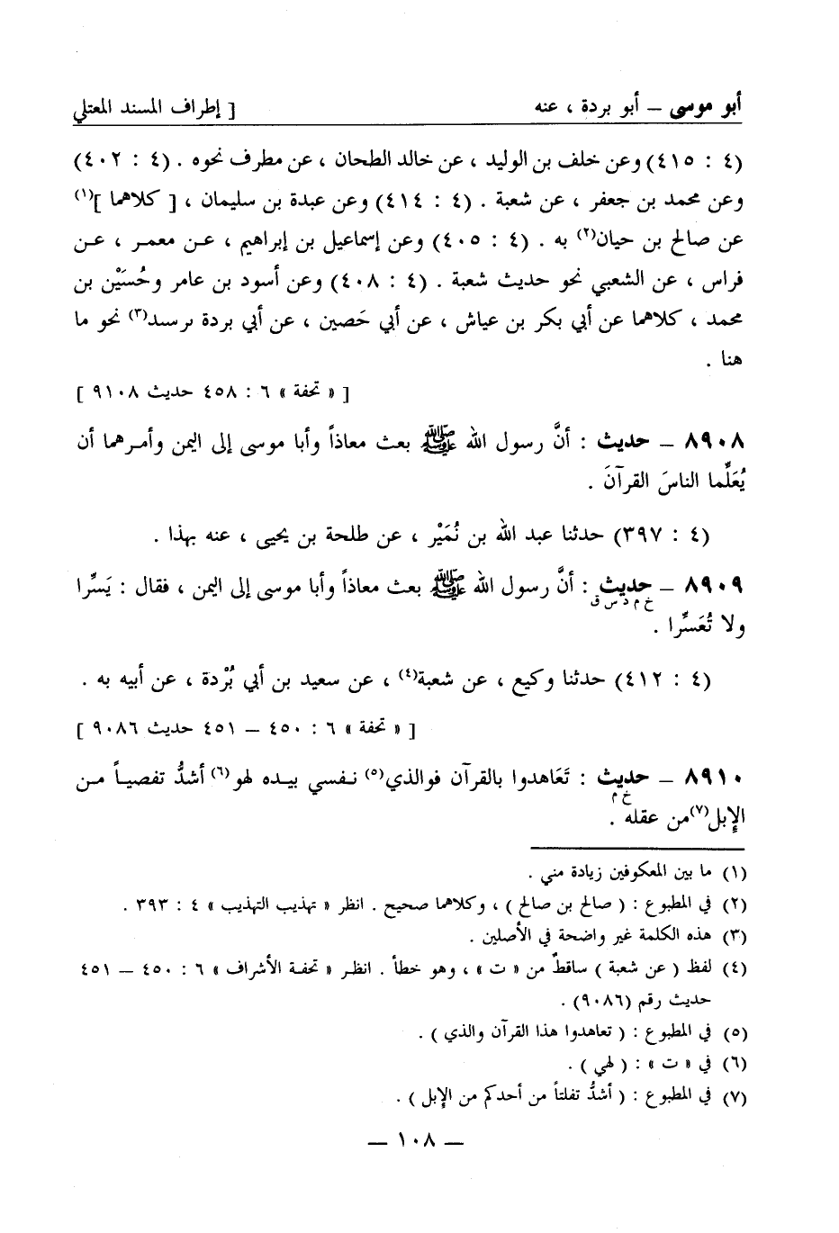 8908 - حديث: أنَّ رسول الله صَلَّى اللَّهُ عَلَيْهِ وَسَلَّمَ بَعَثَ معاذاً وأبا موسى إلى اليمن وأَمَرَهما أن يُعَلِّما الناس القرآن. (4: 397) حَدَّثَنا عبد الله بن نُمَير عن طلحة بن يحيى عنه بهذا