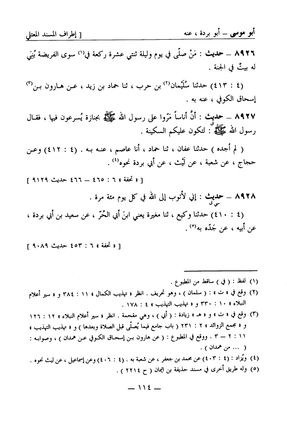 8928 -[سي ق] حديث: إني لأتوب إلى الله في كُلّ يوم مئة مرة (4: 410) حَدَّثَنا وكيع ثنا مغيرة يعني ابن أبي الحُرّ عن سعيد بن أبي بُرْدَة عن أبيه عن جَدِّه به -[115]-