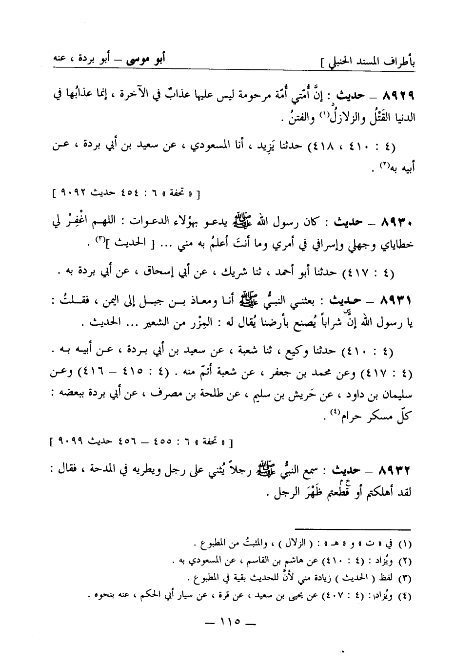 8931 -[س] حديث: بَعَثَني النبيُّ صَلَّى اللَّهُ عَلَيْهِ وَسَلَّمَ أنا ومعاذ بن جبل إلى اليمن فقُلت: يا رسول الله إنَّ شراباً يُصنع بأرضنا يُقال له: المِزْر من الشعير ... الحديث. (4: 410) حَدَّثَنا وكيع ثنا شُعبة عن سعيد بن أبي بُرْدَة عن أبيه به (4: 417) وعن محمد بن جعفر عن شُعبة أتمّ منه (4: 415 - 416) وعن سليمان بن داود عن حَريش بن سليم عن طلحة بن مُصَرِّف عن أبي بُرْدَة ببعضه كُلّ مُسْكِر حَرَام