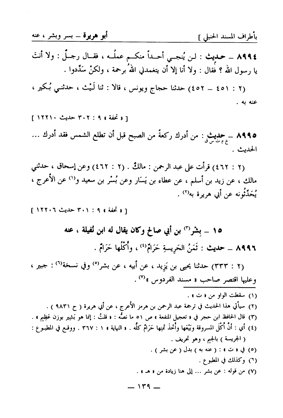 8996 - حديث: ثَمَنُ الحَرِيسة حَرَامٌ وأَكْلُها حَرَام (2: 333) حَدَّثَنا يحيى بن يزيد عن أبيه عن بِشْر وفي نسخة: جُبَير وعليها اقتصر صاحب مسند الفردوس