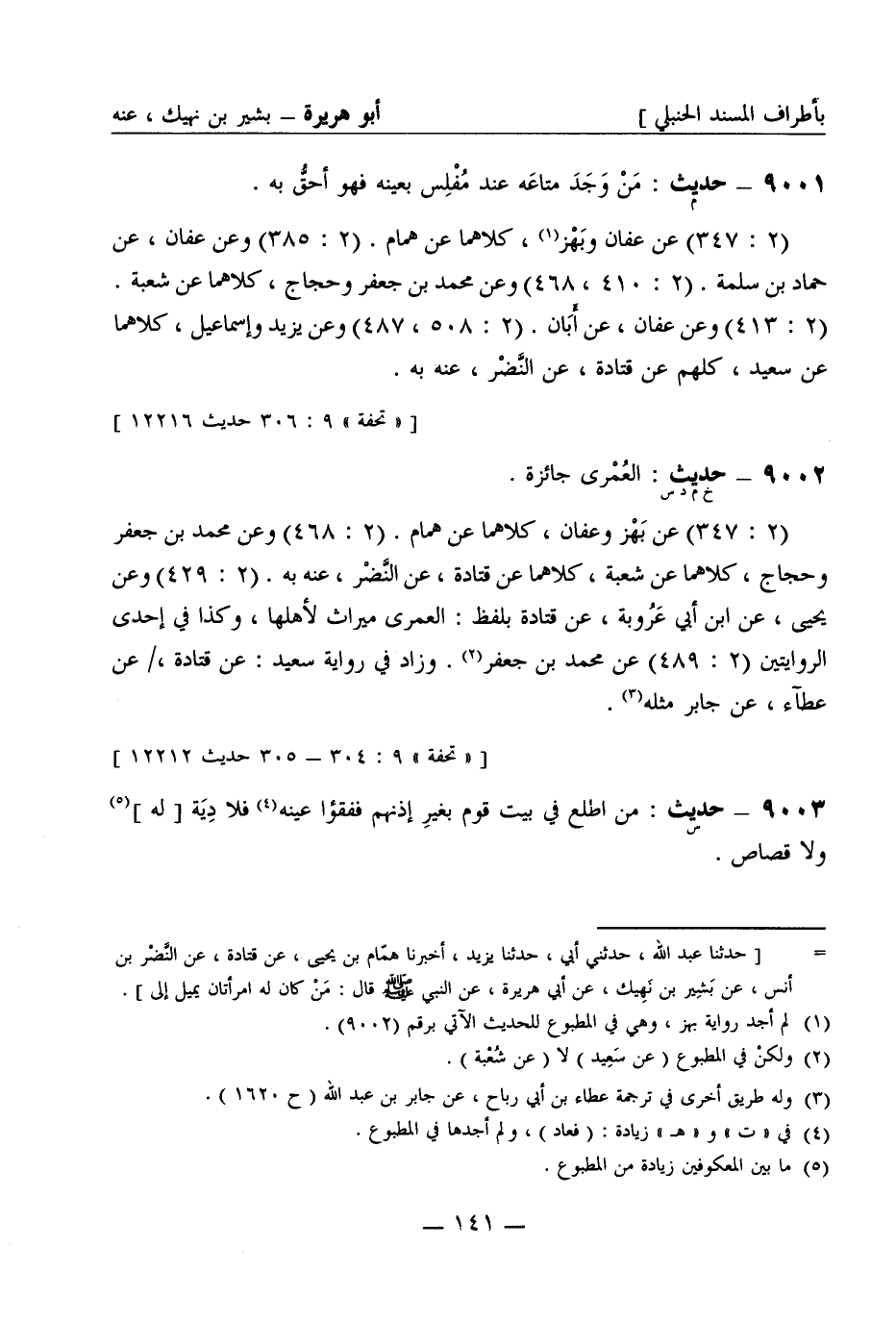 9001 -[م] حديث: من وَجَد متاعَه عند مُفْلِس بعَيْنه فهو أحقُّ به (2: 347) عن عفان وبَهْز كلاهما عن هَمَّام (2: 385) وعن عفان عن حمّاد بن سَلَمة (2: 410، 468) وعن محمد بن جعفر وحجاج كلاهما عن شُعبة (2: 413) وعن عفان عن أَبَان (2: 508، 487) وعن يزيد وإسماعيل كلاهما عن سعيد كُلّهم عن قَتَادة عن النَّضْر عنه به