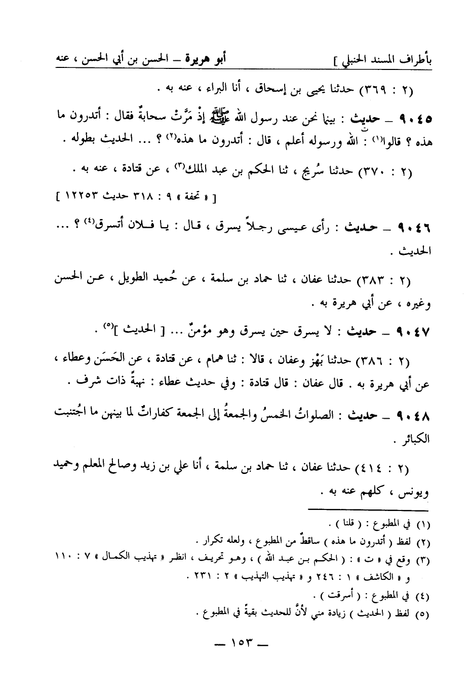 9046 - حديث: رأى عيسى رجلاً يسرق قال: يا فلان أتسرق؟ ... الحديث (2: 383) حَدَّثَنا عفان ثنا حمّاد بن سَلَمة عن حُمَيد الطويل عن الحَسَن وغيره عن أبي هريرة به