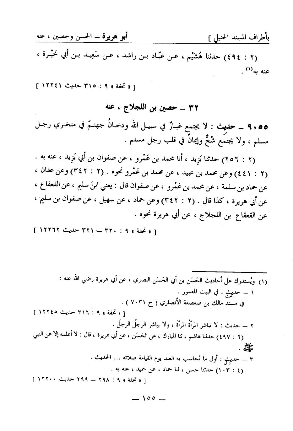 9055 -[س] حديث: لا يجتمع غبارٌ في سبيل الله ودخانُ جهنّم في منخري رجل مسلم ولا يجتمع شُحٌّ وإيمانٌ في قَلْب رجل مسلم (2: 256) حَدَّثَنا يزيد أنا محمد بن عمرو عن صفوان بن أبي زيد عنه به (2: 441) وعن محمد بن عُبَيد عن محمد بن عمرو نحوه (2: 342) وعن عفان عن حمّاد بن سَلَمة عن محمد بن عمرو عن صفوان قال: يعني ابن سُلَيم عن القعقاع عن أبي هريرة كذا قال (2: 342) وعن حمّاد عن سُهَيل عن صفوان بن سُلَيم عن القعقاع بن اللجلاج عن أبي هريرة نحوه
