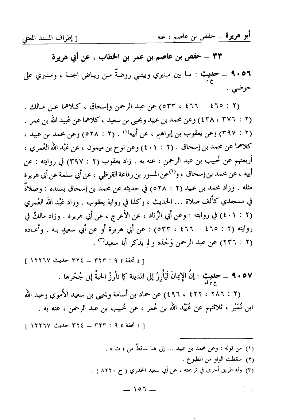 9056 -[خ م] حديث: ما بين منبري وبيتي روضةٌ من رياض الجَنَّة ومنبري على حوضي (2: 465 - 466، 533) عن عبد الرحمن وإسحاق كلاهما عن مالك (2: 376، 438) وعن محمد بن عُبَيد ويحيى بن سعيد كلاهما عن عُبَيد الله بن عمر (2: 397) وعن يعقوب بن إبراهيم عن أبيه (2: 528) وعن محمد بن عُبَيد كلاهما عن محمد بن إسحاق (2: 401) وعن نوح بن ميمون عن عبد الله العُمري أربعتهم عن خُبَيْب بن عبد الرحمن عنه به زاد يعقوب (2: 397) في روايته: عن أبيه عن محمد بن إسحاق وعن المِسْوَر بن رفاعة القُرَظي عن أبي سَلَمة عن أبي هريرة مثله وزاد محمد بن عُبَيد (2: 528) في حديثه عن محمد بن إسحاق بسنده: وصلاةٌ في مسجدي كألف صلاة ... الحديث وكذا في رواية يعقوب وزاد عبد الله العُمري (2: 401) في روايته: وعن أبي الزِّناد عن الأعرج عن أبي هريرة وزاد مالكٌ في روايته (2: 465 - 466، 533) عن أبي هريرة أو عن أبي سعيدٍ به وأعاده (2: 236) عن عبد الرحمن وَحْدَه ولم يذكر أبا سعيد