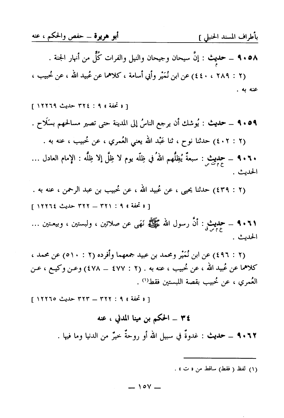 9058 -[م] حديث: إنَّ سيحان وجيحان والنيل والفرات كُلٌّ من أنهار الجَنَّة (2: 289، 440) عن ابن نُمَير وأبي أسامة كلاهما عن عُبَيد الله عن خُبَيْب عنه به