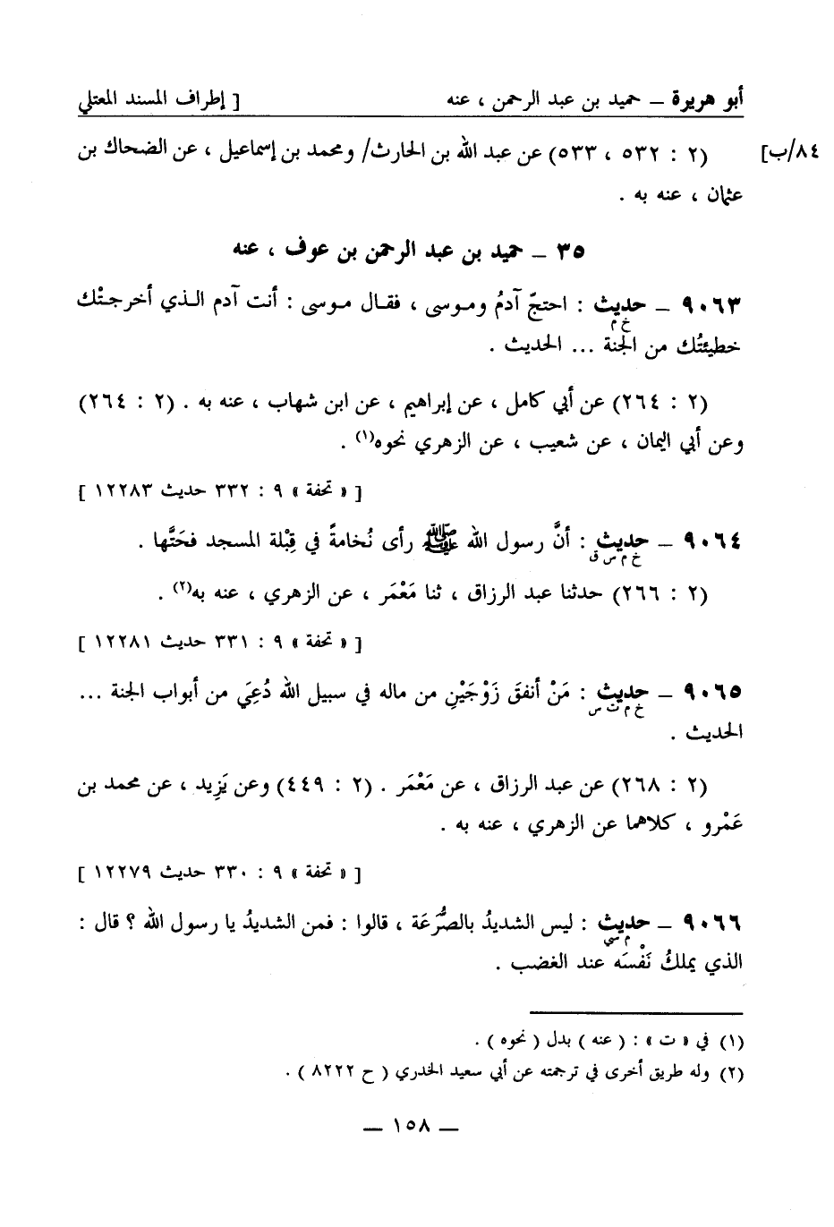 9065 -[خ م ت س] حديث: من أنفق من ماله في سبيل الله دُعِيَ من أبواب الجَنَّة ... الحديث (2: 268) عن عبد الرزاق عن مَعْمَر (2: 449) وعن يزيد عن محمد بن عمرو كلاهما عن الزُّهْرِيّ عنه به