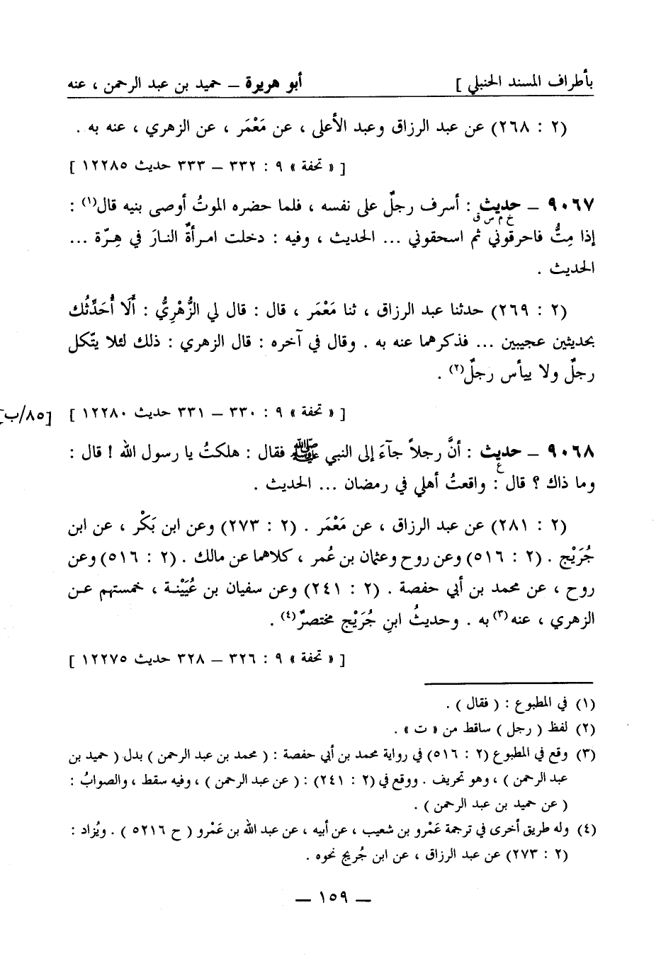 9068 -[ع] حديث: أنَّ رجلاً جاء إلى النبيّ صَلَّى اللَّهُ عَلَيْهِ وَسَلَّمَ فقال: هلكتُ يا رسول الله! قال: وما ذاك؟ قال: واقعتُ أهلي في رمضان ... الحديث (2: 281) عن عبد الرزاق عن مَعْمَر (2: 273) وعن ابن بكر عن ابن جُرَيج (2: 516) وعن رَوْح وعثمان بن عمر كلاهما عن مالك (2: 516) وعن رَوْح عن محمد بن أبي حفصة (2: 241) وعن سفيان بن عُيَينة خمستهم عن الزُّهْرِيّ عنه به وحديث ابن جُرَيج مختصر -[160]-