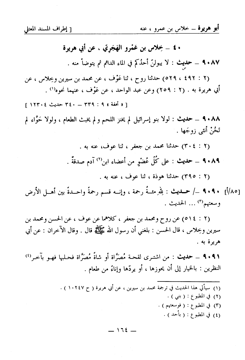 9087 -[س] حديث: لا يَبُولَنَّ أَحَدُكم في الماء الدائم ثم يتوضأ منه (2: 492، 529) حَدَّثَنا رَوْح ثنا عَوْف عن محمد بن سيرين وخِلاس عن أبي هريرة به (2: 259) وعن عبد الواحد عن عَوْف عنهما نحوه