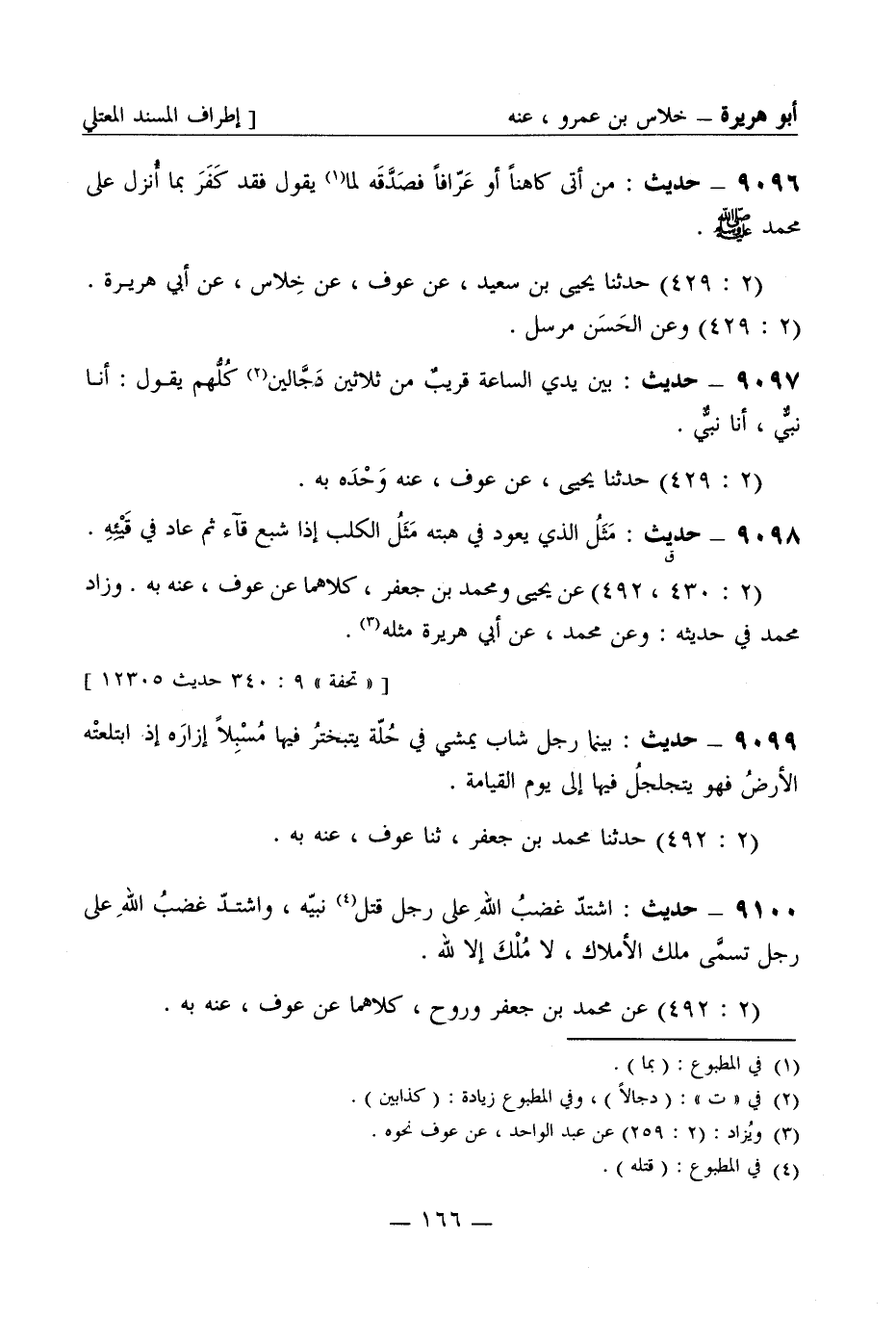 9097 - حديث: بين يدي الساعة قريبٌ من ثلاثين دَجَّالين كُلُّهم يقول: أنا نبيٌّ أنا نبيٌّ (2: 429) حَدَّثَنا يحيى عن عَوْف عنه وَحْدَه به