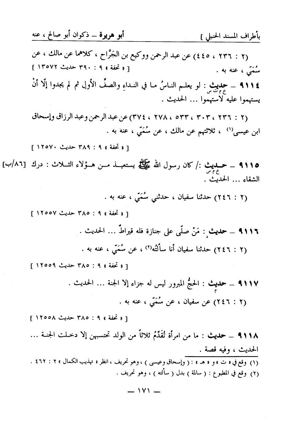 9118 - حديث: ما من امرأة تُقَدِّمُ ثلاثاً من الولد تحتسبهن إلا دخلت الجَنَّة ... الحديث وفيه قصة -[172]- (2: 246) عن سفيان عن سُهَيل عن أبيه به (2: 378) وعن قُتَيبة عن عبد العزيز عن سُهَيل نحوه بلا قصة