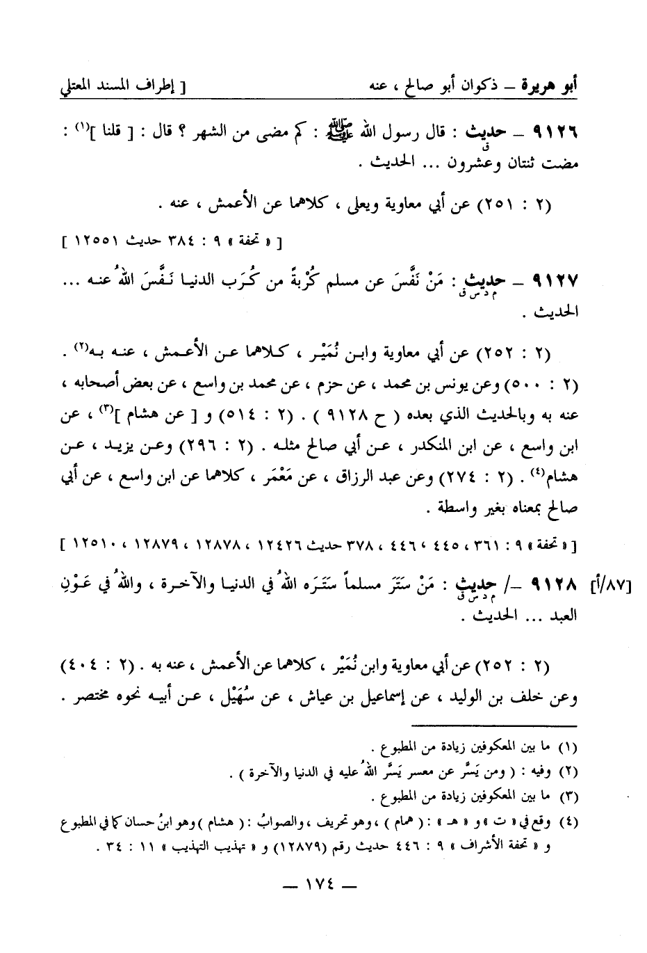 9128 -[م د س ق] من سَتَرَ مسلماً سَتَرَه الله في الدُّنيا والآخرة والله في عَوْنِ العبد ... الحديث (2: 252) عن أبي معاوية وابن نُمَير كلاهما عن الأعمش عنه به (2: 404) وعن خلف بن الوليد عن إسماعيل بن عَيَّاش عن سُهَيل عن أبيه نحوه مختصر -[175]- (2: 388 - 389) وعن عفان عن وُهَيْب عن سُهَيل كذلك