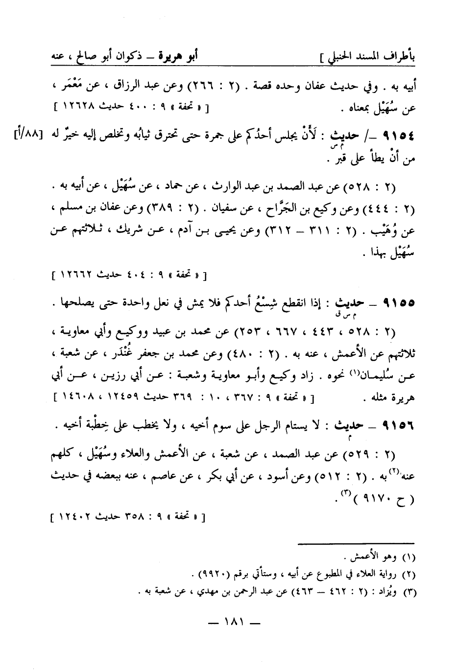 9155 -[م س ق] حديث: إذا انقطع شِسْعُ أَحَدكم فلا يمش في نعل واحدة حتى يصلحها (2: 528، 443، 667، 253) عن محمد بن عُبَيد ووكيع وأبي معاوية ثلاثتهم عن الأعمش عنه به (2: 480) وعن محمد بن جعفر غُنْدَر عن شُعبة عن سليمان نحوه زاد وكيع وأبو معاوية وشُعبة: عن أبي رَزِين عن أبي هريرة مثله