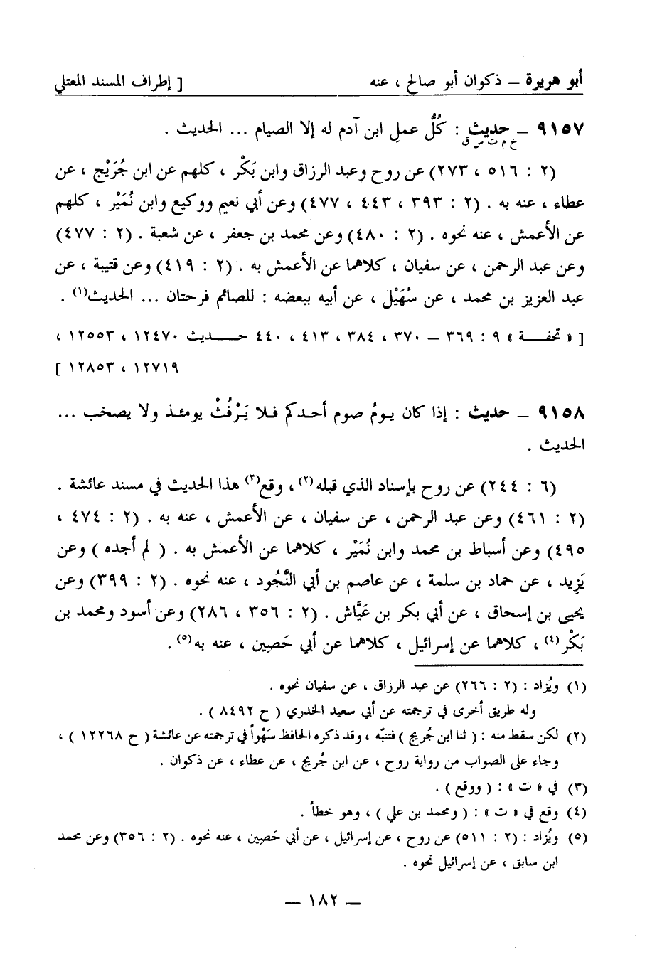 9157 -[خ م ت س ق] حديث كُلُّ عملِ ابن آدم له إلا الصيام ... الحديث (2: 516، 273) عن رَوْح وعبد الرزاق وابن بكر كُلّهم عن ابن جُرَيج عن عطاء عنه به (2: 393، 443، 477) وعن أبي نُعيم ووكيع وابن نُمَير كُلّهم عن الأعمش عنه نحوه (2: 480) وعن محمد بن جعفر عن شُعبة (2: 477) وعن عبد الرحمن عن سفيان كلاهما عن الأعمش به (2: 419) وعن قُتَيبة عن عبد العزيز بن محمد عن سُهَيل عن أبيه ببعضه: للصائم فرحتان ... الحديث