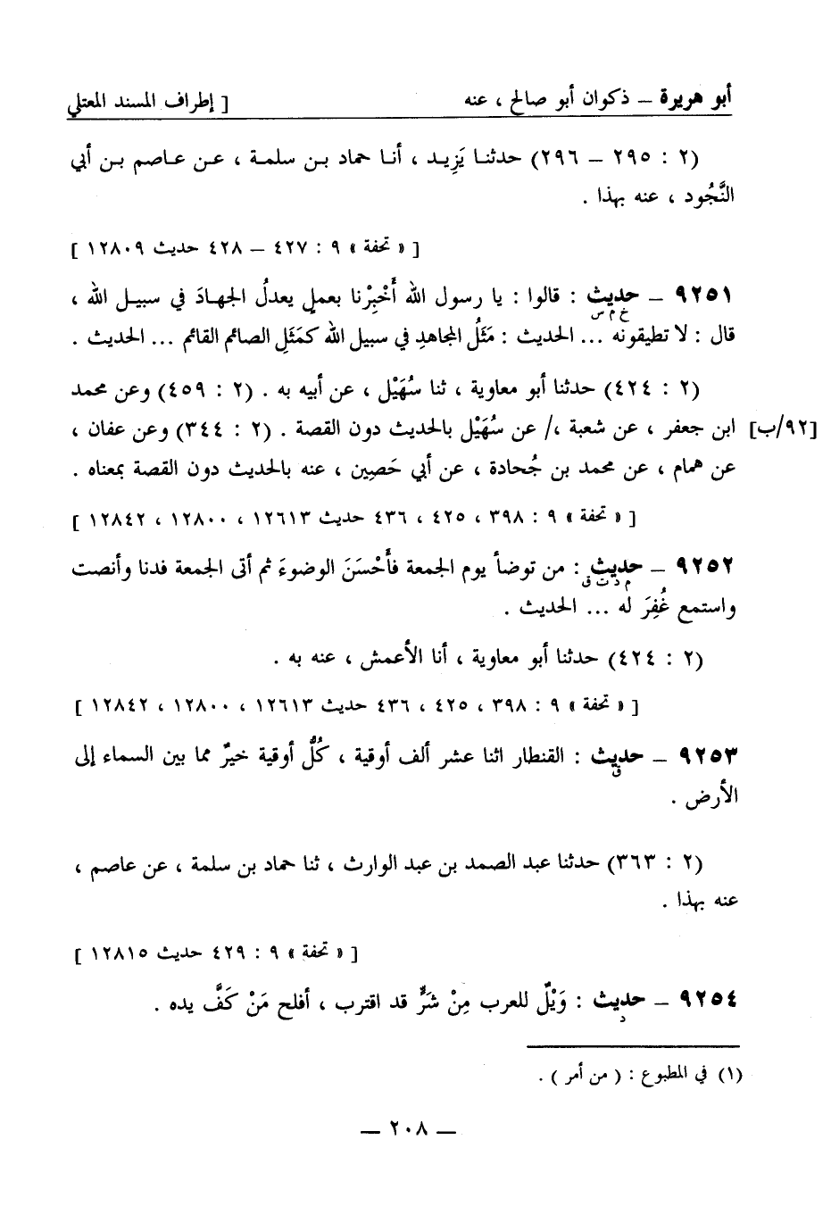 9252 -[خ م س] حديث قالوا يا رسول الله أخبرنا بعملٍ يعدلُ الجهادَ في سبيل الله قال لا تطيقونه ... الحديث مَثَلُ المجاهدِ في سبيل الله كمَثَلِ الصائم القائم ... الحديث (2: 424) حَدَّثَنا أبو معاوية ثنا سُهَيل عن أبيه به (2: 459) وعن محمد بن جعفر عن شُعبة عن سُهَيل بالحديث دون القصة (2: 344) وعن عفان عن هَمَّام عن محمد بن جُحادة عن أبي حَصِين عنه بالحديث دون القصة بمعناه