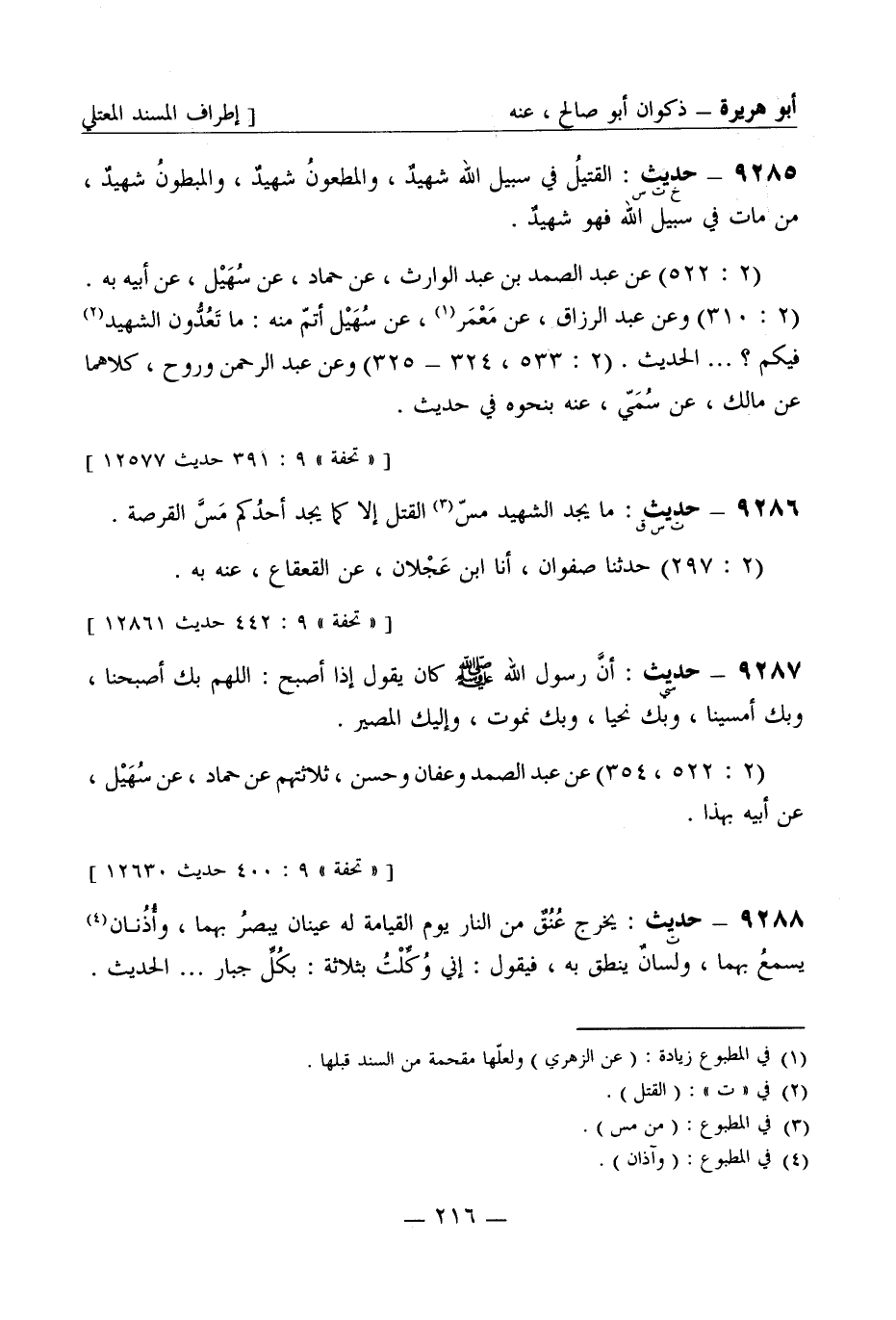 9286 -[خ ت س] حديث القتيلُ في سبيل الله شهيدٌ والمطعونُ شهيدٌ والمبطونُ شهيدٌ من مات في سبيل الله فهو شهيد (2: 522) عن عبد الصمد بن عبد الوارث عن حمّاد عن سُهَيل عن أبيه به (2: 310) وعن عبد الرزاق عن مَعْمَر عن سُهَيل أتمّ منه ما تَعُدُّون الشَّهيد فيكم؟ ... الحديث (2: 533، 324 - 325) وعن عبد الرحمن ورَوْح كلاهما عن مالك عن سُمَيّ عنه بنحوه في حديث