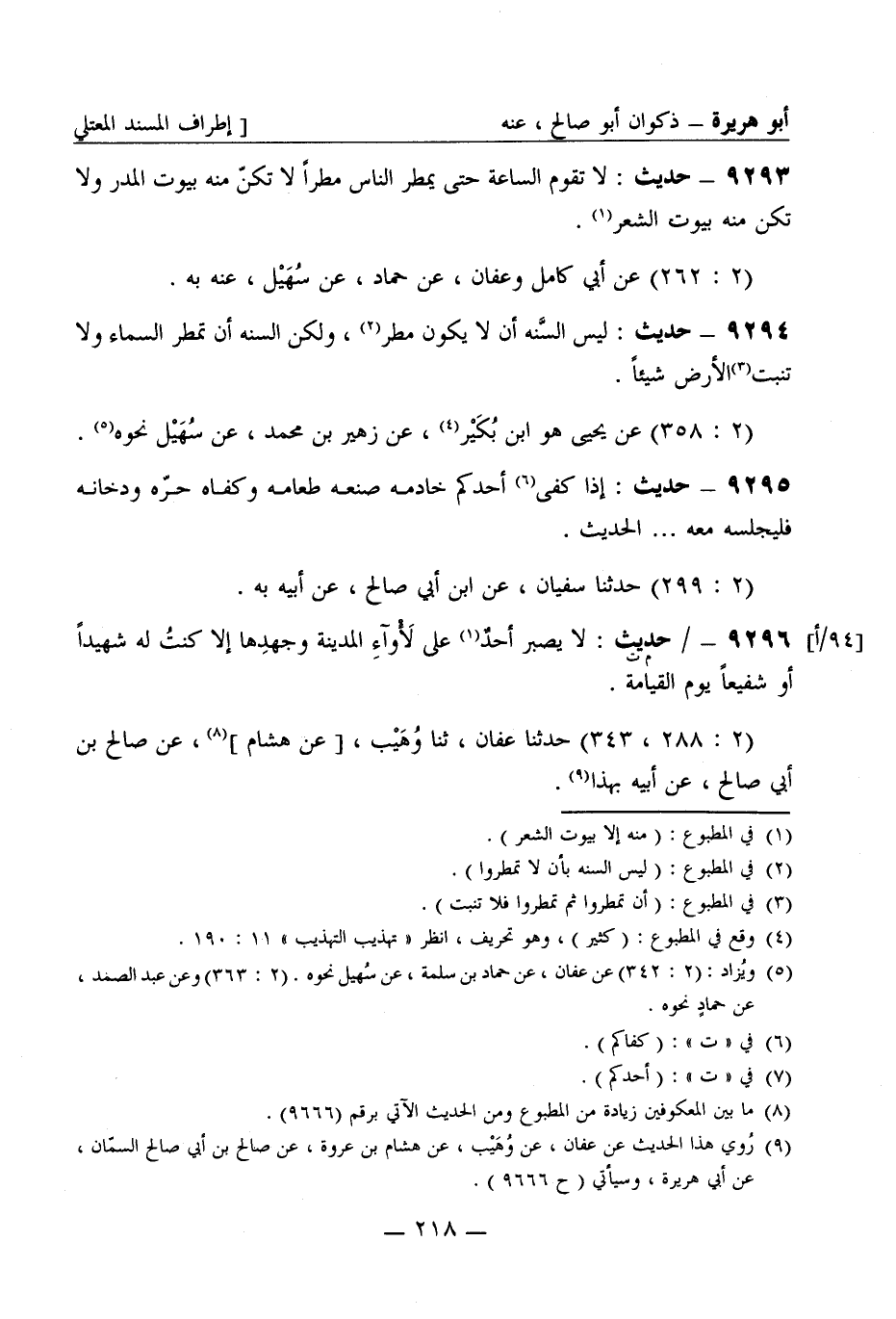 9293 - حديث لا تقوم الساعة حتى يمطر الناس مطراً لا تكنّ منه بيوت المدر ولا تكنّ منه بيوت الشعر (2: 262) عن أبي كامل وعفان عن حمّاد عن سُهَيل عنه به