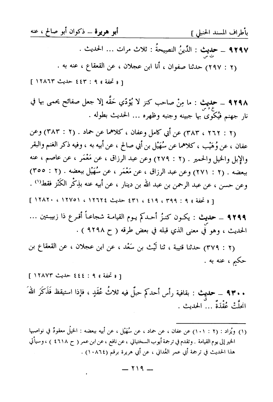 9298 -[خ د س] حديث ما من صاحب كَنْز لا يُؤدّي حَقَّه إلا جعل صفائح يحمى بها في نار جهنّم فيُكوى بها جبينه وجنبه وظَهْره ... . الحديث بطوله. (2: 262، 383) عن أبي كامل وعفان كلاهما عن حمّاد (2: 383) وعن عفان عن وُهَيْب كلاهما عن سُهَيل بن أبي صالح عن أبيه به وفيه ذكر الغنم والبقر والإبل والخيل والحمير (2: 279) وعن عبد الرزاق عن مَعْمَر عن عاصم عنه ببعضه (2: 271) وعن عبد الرزاق عن مَعْمَر عن سُهَيل ببعضه (2: 355) وعن حَسَن عن عبد الرحمن بن عبد الله بن دينار عن أبيه عنه بذِكْر الكَنْز فقط