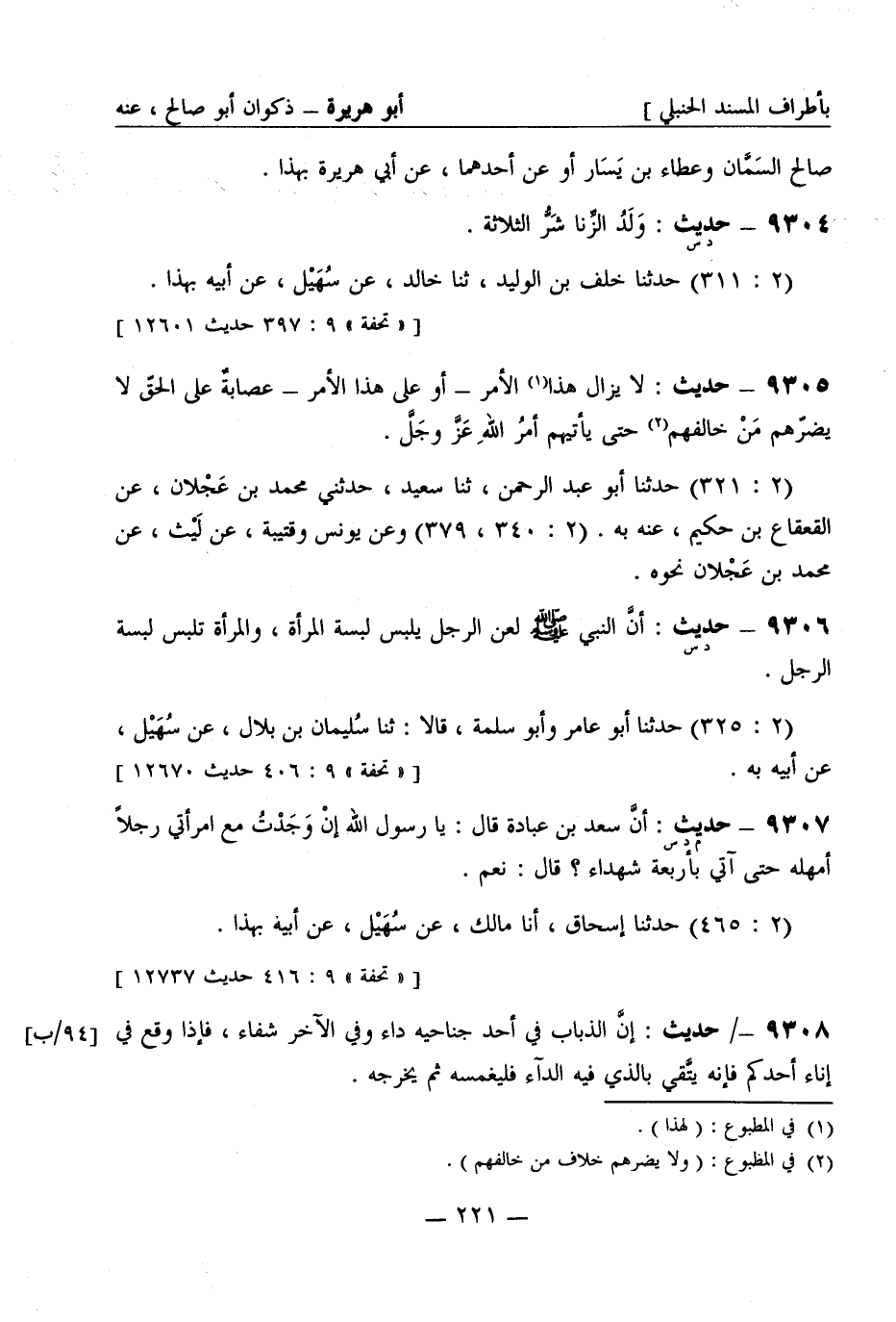 9305 - حديث لا يزال هذا الأمر أو على هذا الأمر عصابةٌ على الحقّ لا يضرّهم من خالفهم حتى يأتيهم أمرُ الله عَزَّ وجَلّ. (2: 321) حَدَّثَنا أبو عبد الرحمن ثنا سعيد حَدَّثَني محمد بن عَجْلان عن القعقاع بن حكيم عنه به (2: 340، 379) وعن يونس وقُتَيبة عن لَيْث عن محمد بن عَجْلان نحوه.