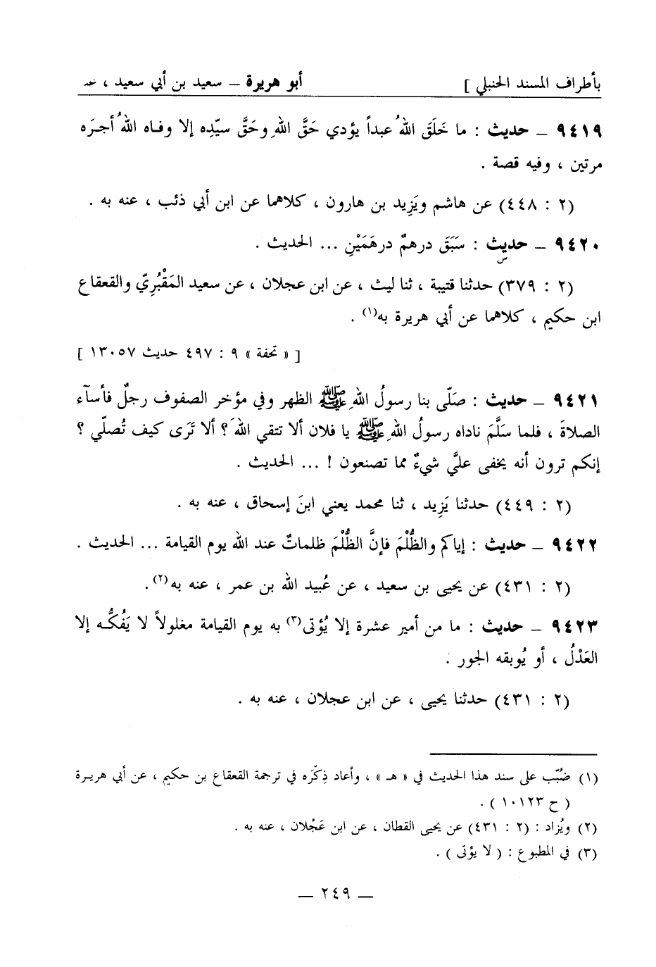 9423 - حديث ما من أمير عشرة إلا يُؤتي به يوم القيامة مغلولاً لا يَفُكُّه إلا العَدْلُ أو يُوبقه الجور (2: 431) حَدَّثَنا يحيى عن ابن عَجْلان عنه -[250]- به
